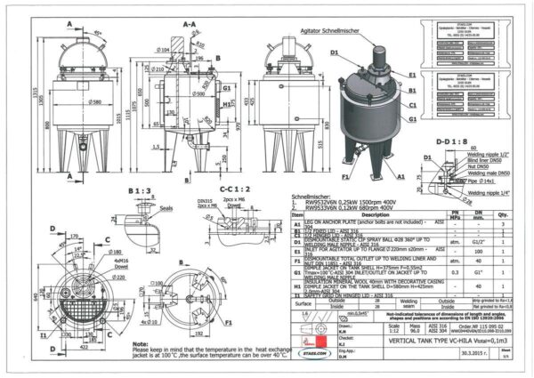 Arbetstemperatur värmeväxlare cylinder: 100 °C Höjd värmeväxlare: 375 mm Hydrauliskt provtryck botten: 4,50 Bar Hydrauliskt provtryck: 4,50 Bar Kontaktyta cylinder: 0,55 m² Position värmeväxlare: the complet cilinder Typ av värmeväxlare på cylinder: dimple-jacket Vattentryck värmeväxlare: 3 Bar