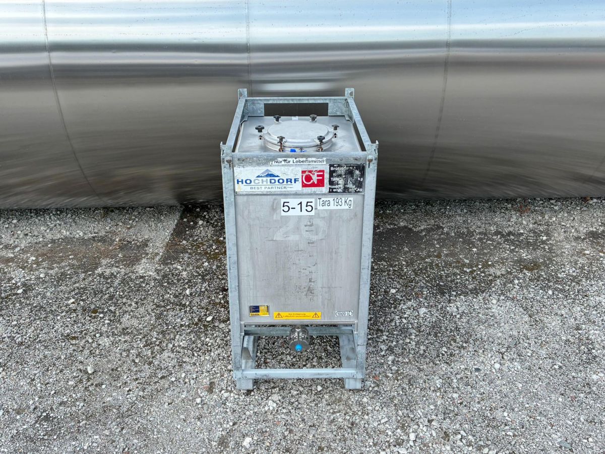 Article type: second-hand transport tank Additional information: previous product was condensed milk Volumetric volume (L): 1.000 L Pressure in tank: pressure Max. pressure (Bar): 0,20 Bar Material wet parts: SS AISI 304 (V2A) Model: vertical Configuration: single-skin Heat exchanger: no Insulation: no Mobile tank: no Top type: flat Shape of tank: square Bottom type: conical Bottom outlet: yes Total discharge: yes Fixation points: 4 stackable frame Manway(s): RVS 304 Gasket manway(s): unknown Fixation point(s): RVS 304 Suitable for food industry: yes Documents included: no Technical drawing included: no Registration plate on the tank: yes Flange for agitator: no Number of manways: 1 Position of manway: headside Height manhole 1 (mm): 425 mm Hinged lid: yes Tank outlet: inside Ø 80 mm Outlet type: DIN11851 Total outlet valve: yes Agitator: no Distance from outlet to ground: 300 mm Cylinder height: 910 mm Total height of tank: 1.710 mm Total outer width: 850 mm Total outer length: 1.210 mm Empty weight tank: 500