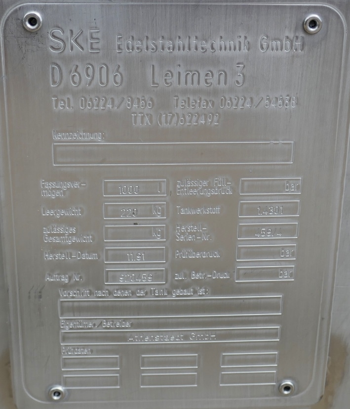 1000 liter tank i Rostfritt 304