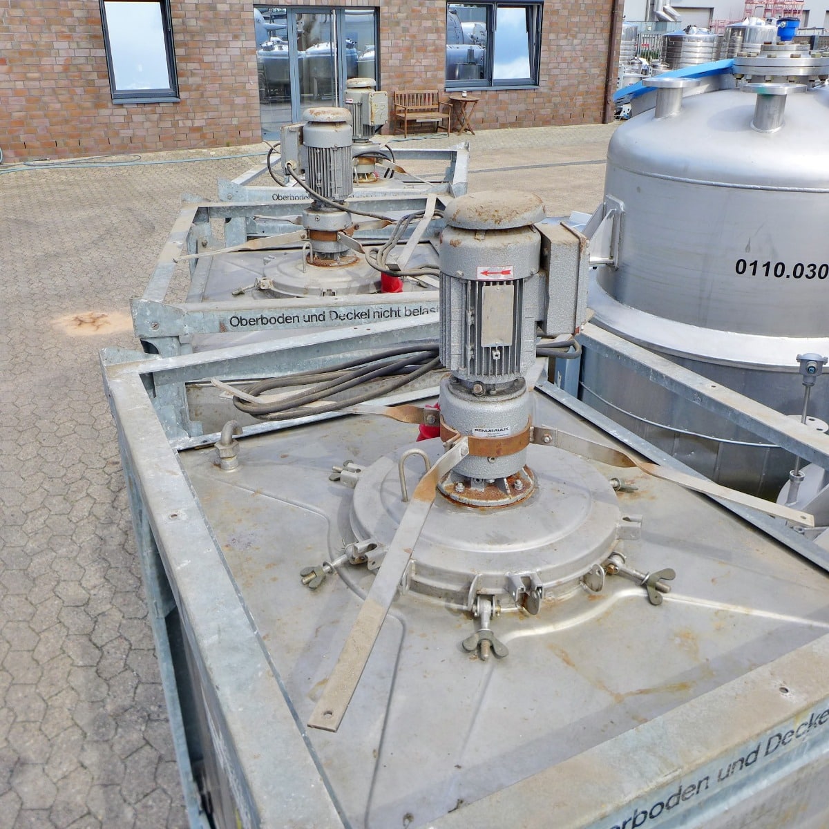 Anpassad för industriell lagring erbjuder 1000 liter tank i Rostfritt 304 en säker och effektiv tanklösning. Med volym: 1000 liter, begagnad, med ett arbetstryck på ATM - atmosferic, vätskeberörd yta: SS AISI 304 (V2A), konfiguration: single-skin, stationär tank, total urtappning finns, utan dokumentation, utan teknisk ritning, med märkskylt, utan fläns för omrörare, varvtal: 299, med kraft på 0,75 kW, modell: Vertikal, tillverkad i Rostfritt 304, med omrörare, utan uppvärmning/kylning, utan isolering, total höjd: 2.060 mm är den redo för professionell användning.