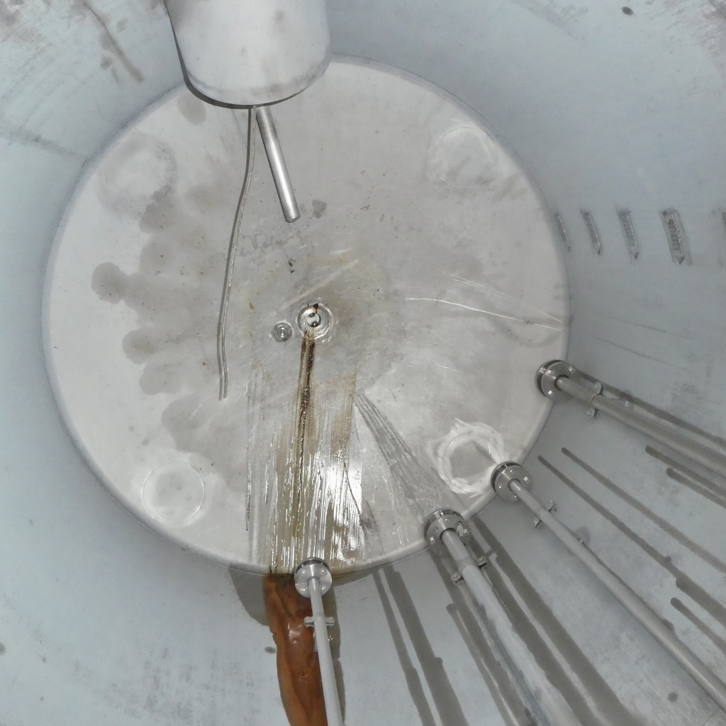 a dent in the cylinder; in the case of a tank, 2 base plates of the feet are bent; connections in the upper bottom are partially bent ; some residues of previous content