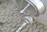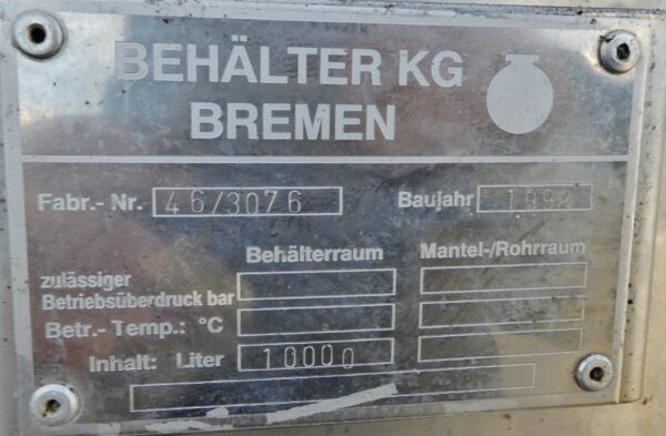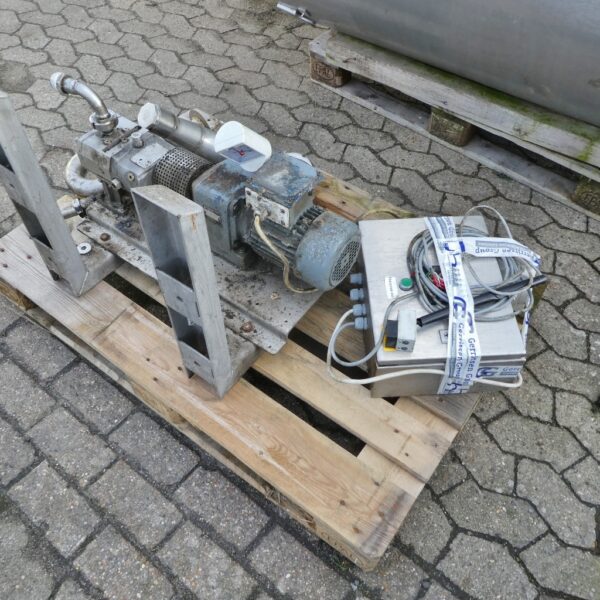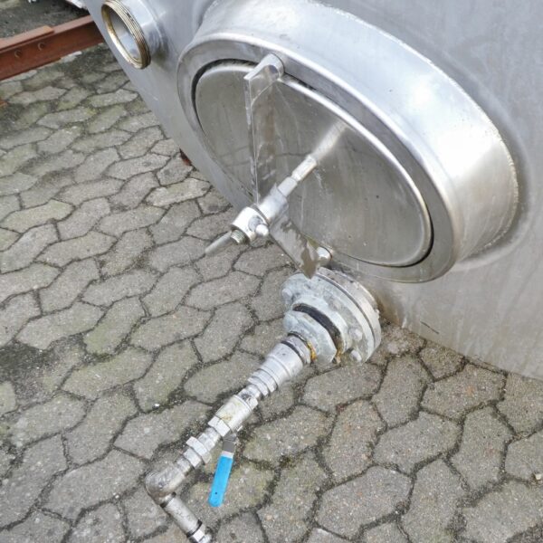 Cooking oil; 1 manhole appr. 340 x 440 mm in the front bottom; a reducing fitting flanged to the outlet (inside diameter at the end approx. 30 mm); 1 pallet with a pump, a control cabinet, etc. is