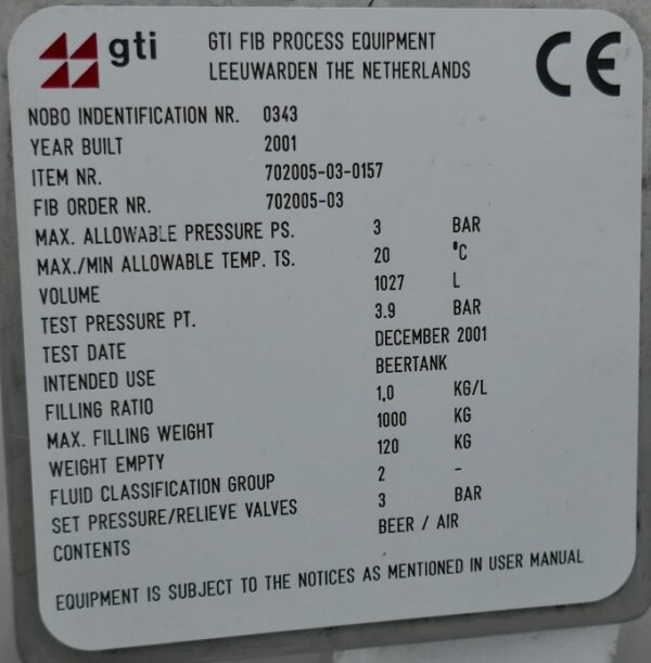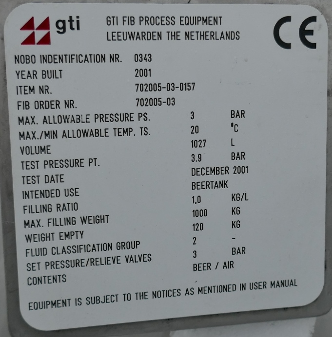 Beer storage; Tanks lie loosely in frames, made of Aisi 304, which are screwed together in pairs; 1 hand hole each approx. 215 x 240 mm in the front bottom (plastic hand hole cover); 1 pipe inside;