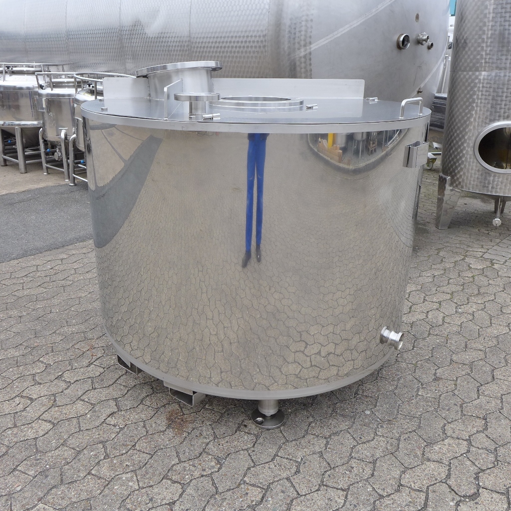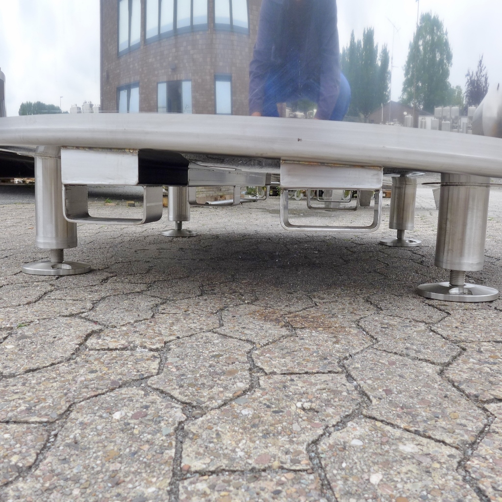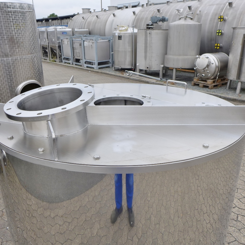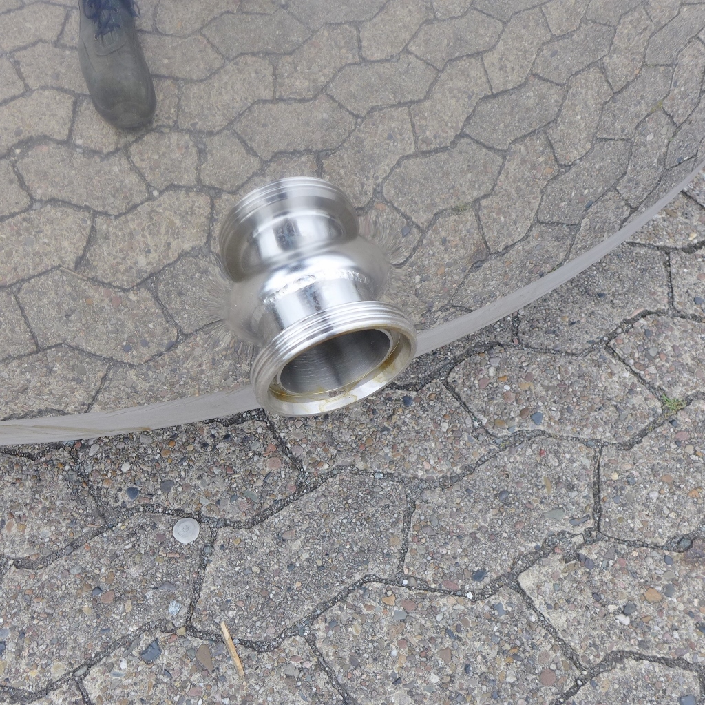 Outlet DN 60 DIN 11851; reinforcement ribs inside under the upper bottom (removable); 2 fork pockets on the outside of the lower bottom; we can’t give any guarantees about the heating/cooling jacket