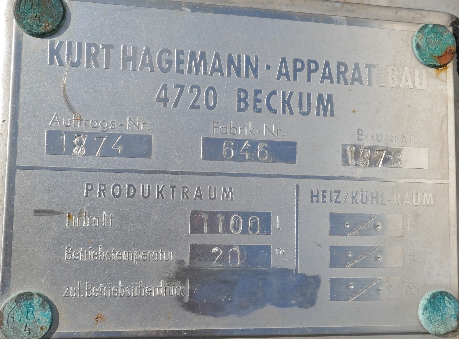 Additional information: Chemistry; Manhole diameter 400 mm (flange ring made of Fe; manhole cover screws missing); 1 crane eye in the upper bottom; Former connections welded shut by the previous operator