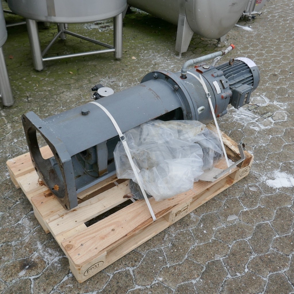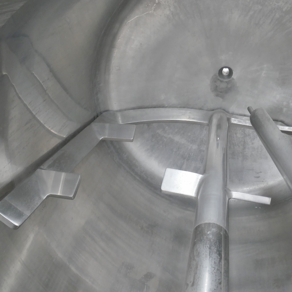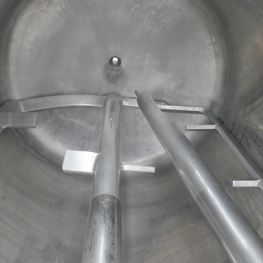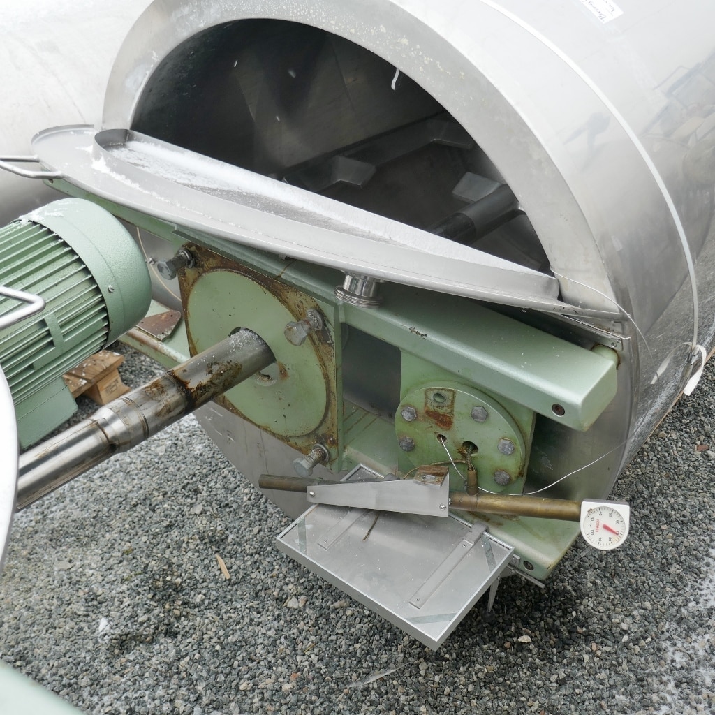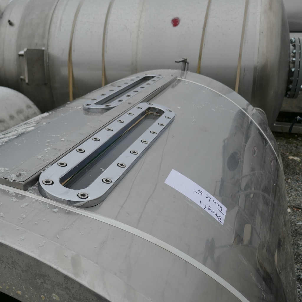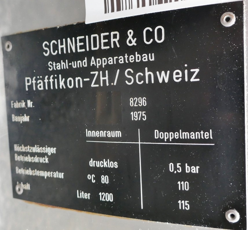 Additional information: Pharmacy; 2 longitudinal sight glasses in the cylinder; bump at the insulation jacket Volumetric volume (L): 1.200 L Pressure in tank: ATM - atmosferic Max. temperature (°C): 80 °C Material wet parts: SS AISI 304 (V2A) Model: vertical Configuration: insulated with heat-exchanger Heat exchanger: yes Insulation: yes Mobile tank: no Total discharge: yes Volume: 115 L Max Overpressure: 0,50 Bar Max. working temperature: 110 °C Type HE on the bottom: heating/cooling jacket Type HE on the cylinder: heating/cooling jacket Documents included: no Technical drawing included: no Registration plate on the tank: yes Flange for agitator: no Outlet of tank: 33 Agitator: yes Number of revolutions: 15 / 30 Power: 2.6 / 3.75 Internal diameter tank: 1.090 mm Outer diameter tank: 1.260 mm Total height of tank: 4.000 mm Empty weight tank: 750