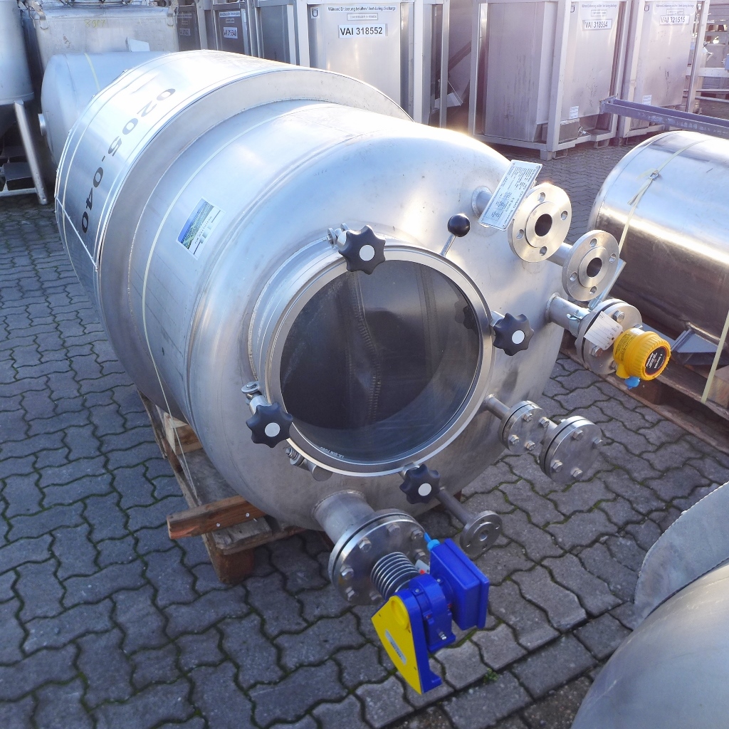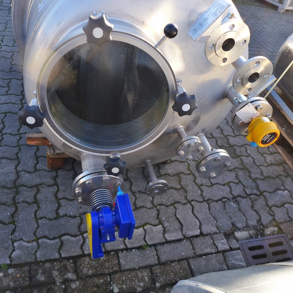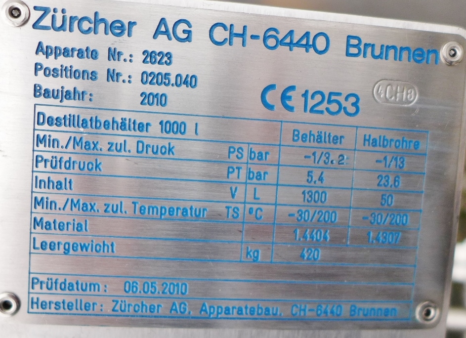 Additional information: Pharmaceutical Chemistry; Further technical documents available; Manhole cover with large sight glass; Loose flanges of the outlet fitting DN 50 & DN 25 made of Fe; bump at the insulation jacket Volumetric volume (L): 1.300 L Pressure in tank: pressure and vacuum Max. pressure (Bar): 3,20 Bar Min. pressure (Bar): 1 Bar Max. temperature (°C): 200 °C Material wet parts: SS AISI 316 (V4A) Model: vertical Configuration: insulated with heat-exchanger Heat exchanger: yes Insulation: yes Mobile tank: no Total discharge: yes Volume: 50 L Max Overpressure: 13 Bar Max onderdruk: 1 Bar Max. working temperature: 200 °C Type HE on the bottom: half pipe welded onto the outside of the innertank Type HE on the cylinder: half pipe welded onto the outside of the innertank Heat exchanger: RVS 304 Documents included: no Technical drawing included: no Registration plate on the tank: yes Flange for agitator: no Position of manway: in the bottom Outlet of tank: available Cylinder: 5 mm Bottom: 4,70 mm Internal diameter tank: 1.000 mm Outer diameter tank: 1.160 mm Cylinder height: 1.380 mm Total height of tank: 2.450 mm