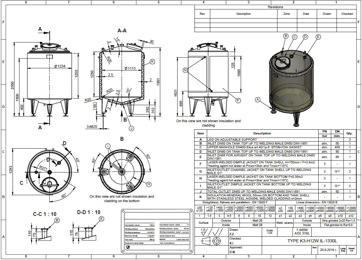 Fläns för omrörare: Nej Märkskylt: Ja Livsmedelsklassad: Ja med besiktning av: TUV Tankutlopp: inside Ø 50 mm Teknisk ritning finns: Ja Utloppstyp: DIN11851 male