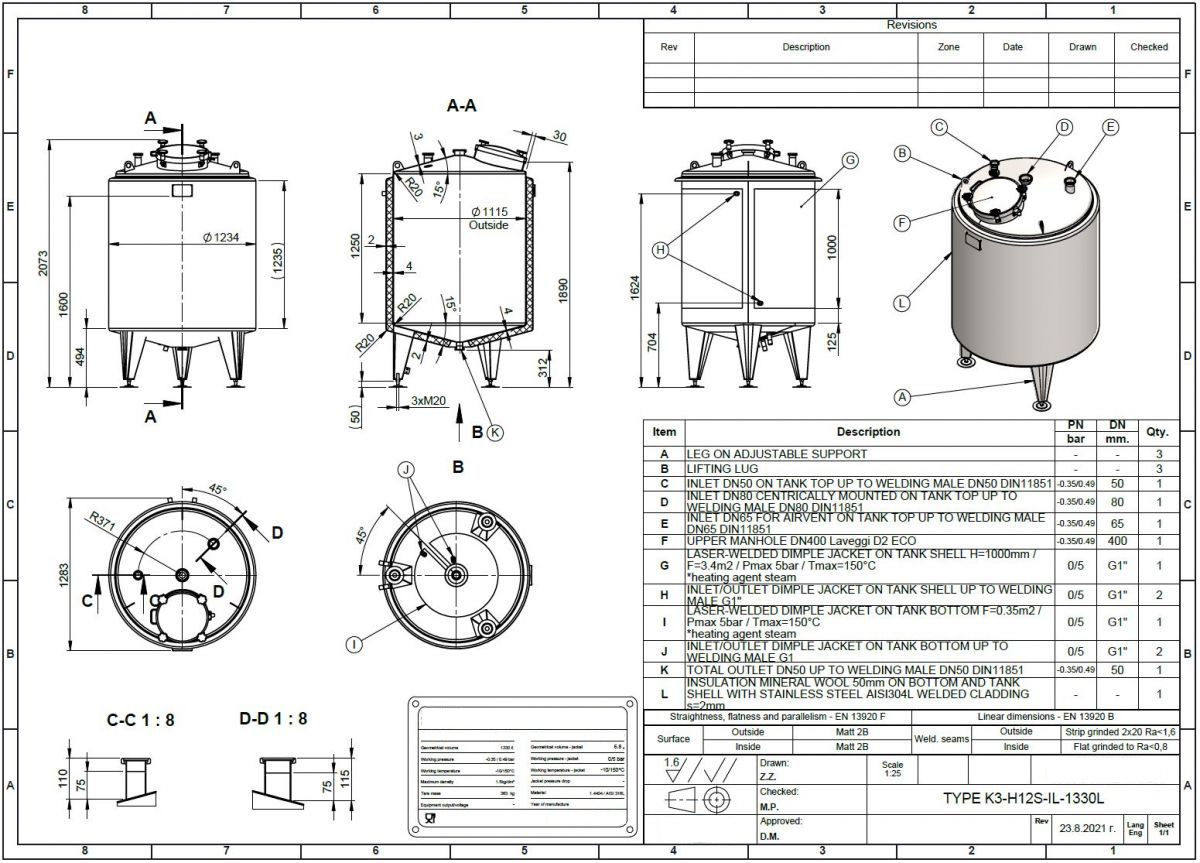 Ångtryck värmeväxlare: 5 Bar Ångtryck värmeväxlare botten: 5 Bar Anslutning värmeväxlare: 1" BSP Anslutning värmeväxlare botten: 1" BSP Arbetstemperatur värmeväxlare cylinder: 150 °C Arbetstemperatur värmeväxlare botten: 150 °C Höjd värmeväxlare: 1.000 mm Kontaktyta botten: 0,35 Kontaktyta cylinder: 3,40 m² Position värmeväxlare: the complet cilinder Typ av värmeväxlare på cylinder: dimple-jacket Typ av värmeväxlare på botten: dimple-jacket Vattentryck värmeväxlare: 5 Bar Vattentryck värmeväxlare botten: 5 Bar