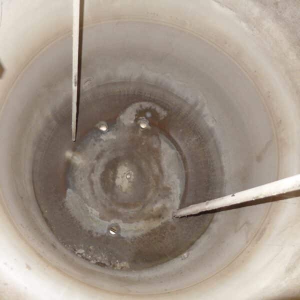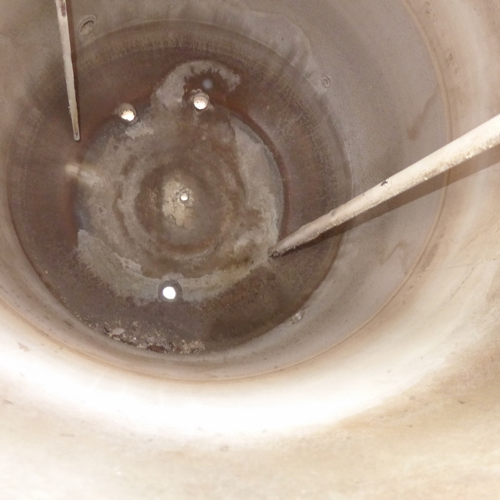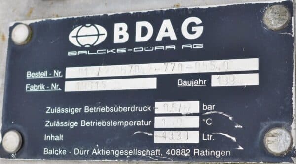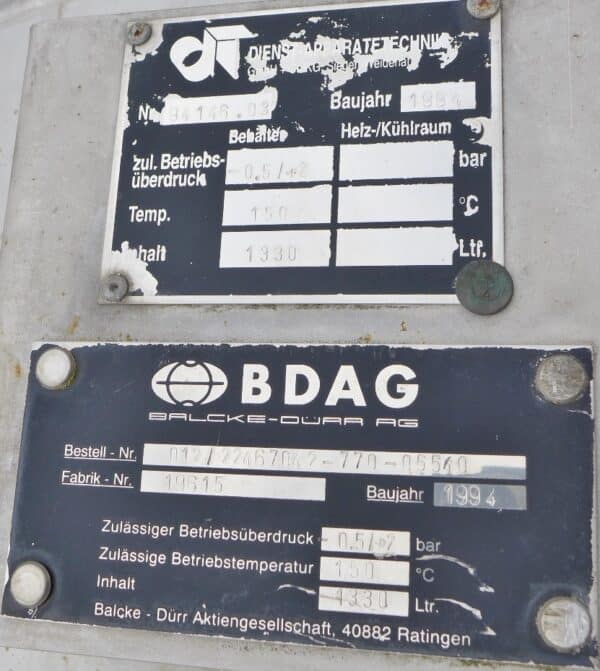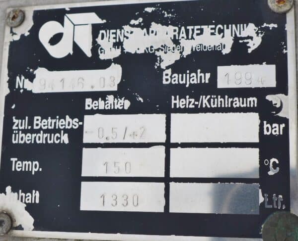 Manhole diameter 350 mm; 2 support brackets, Aisi 316; 1 connection in the cylinder bent; Connections upper bottom: 1 x DN 100; 5 x DN 50; 2 x DN 25 ; some residues of previous content