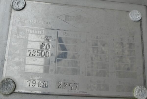 Brewery; Test certificate available; 1 heating / cooling ring (approx. 125 mm wide) around the lower cylinder area; 1 foot without height-adjustable screw and slightly shorter (presumably formerly