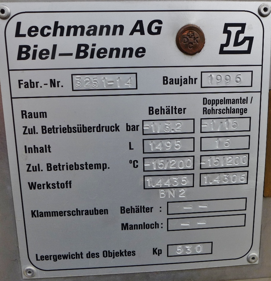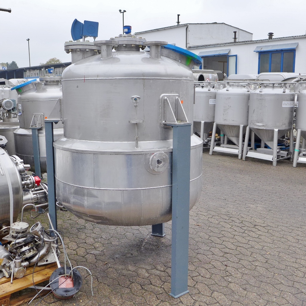 Pharmaceutical chemistry ; Half-coil, Aisi 304 around the lower cylinder area and the lower bottom; 3 feet, Fe screwed to 3 support brackets, st. st.; bump at the insulation jacket;manhole cover is