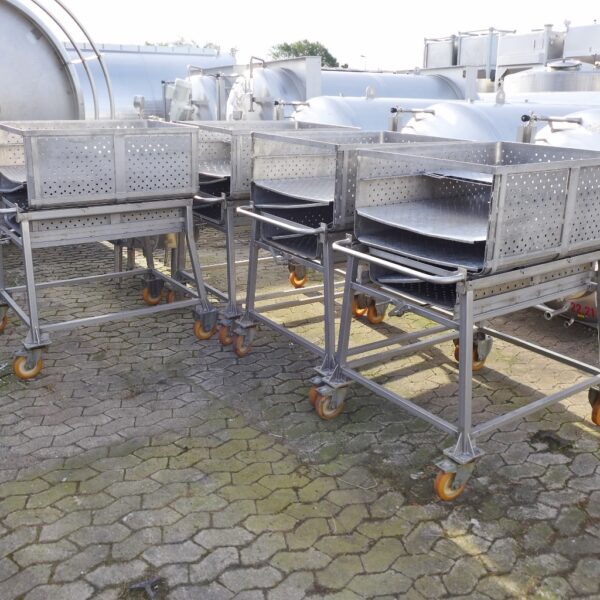 Food industry; 2 loading trolleys, Aisi 304 are included in the scope of delivery; 1 tank approx. 200 mm shorter in total length due to a cut rod; some residues of previous content; we can’t give