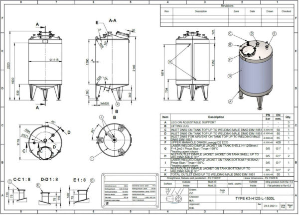 Ångtryck värmeväxlare: 5 Bar Ångtryck värmeväxlare botten: 5 Bar Anslutning värmeväxlare: 1" BSP Anslutning värmeväxlare botten: 1" BSP Arbetstemperatur värmeväxlare cylinder: 150 °C Arbetstemperatur värmeväxlare botten: 150 °C Höjd värmeväxlare: 1.250 mm Kontaktyta botten: 0,35 Kontaktyta cylinder: 4,20 m² Position värmeväxlare: the complet cilinder Typ av värmeväxlare på cylinder: dimple-jacket Typ av värmeväxlare på botten: dimple-jacket Vattentryck värmeväxlare: 5 Bar Vattentryck värmeväxlare botten: 5 Bar