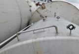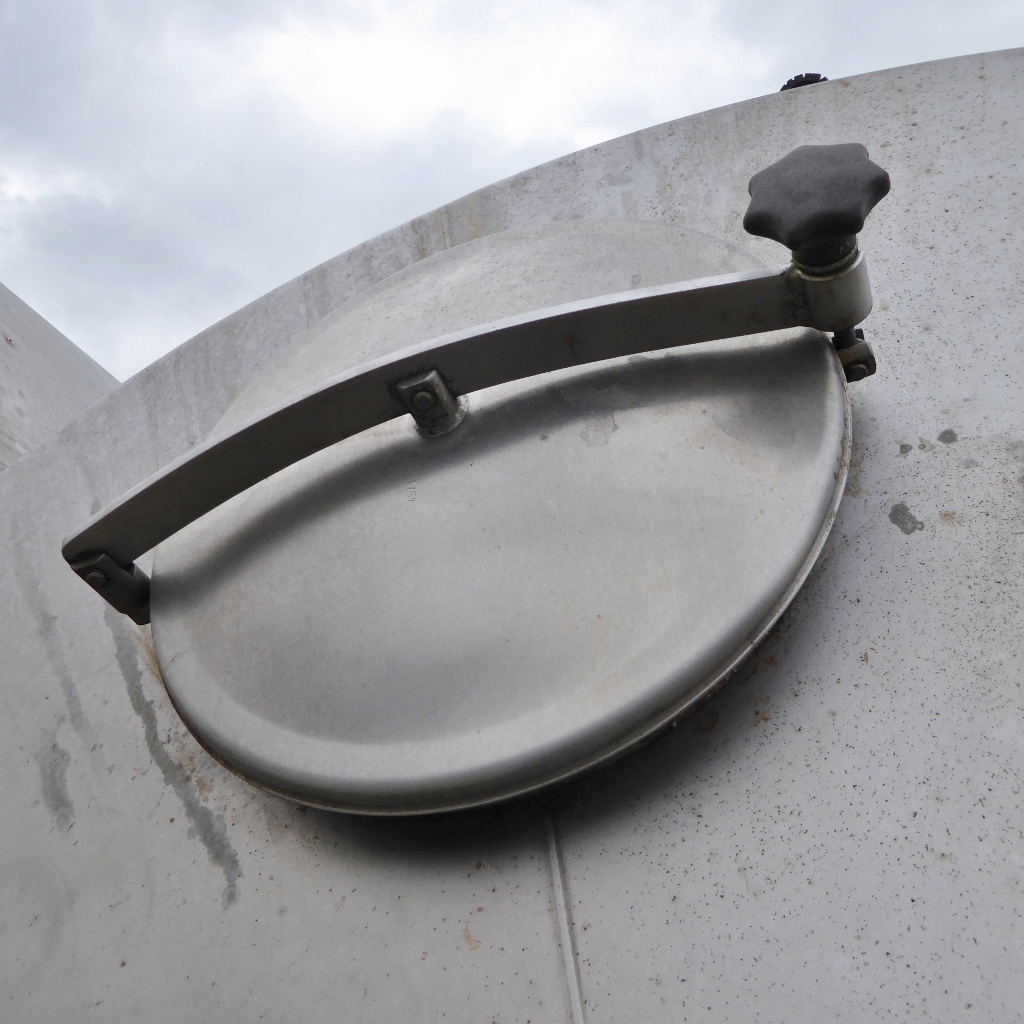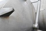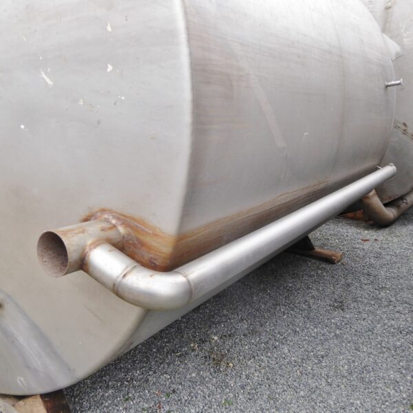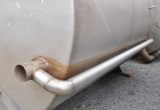 Cip-tank in a brewery; 1 lateral pipeline outside; 1 short tube inside; height-adjustable screws of the feet are missing