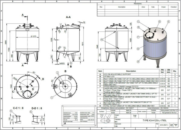 Ångtryck värmeväxlare: 5 Bar Ångtryck värmeväxlare botten: 5 Bar Anslutning värmeväxlare: 1" BSP Anslutning värmeväxlare botten: 1" BSP Arbetstemperatur värmeväxlare cylinder: 150 °C Arbetstemperatur värmeväxlare botten: 150 °C Höjd värmeväxlare: 1.000 mm Kontaktyta botten: 0,30 Kontaktyta cylinder: 3,80 m² Position värmeväxlare: the complet cilinder Typ av värmeväxlare på cylinder: dimple-jacket Typ av värmeväxlare på botten: dimple-jacket Vattentryck värmeväxlare: 5 Bar Vattentryck värmeväxlare botten: 5 Bar