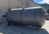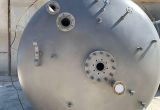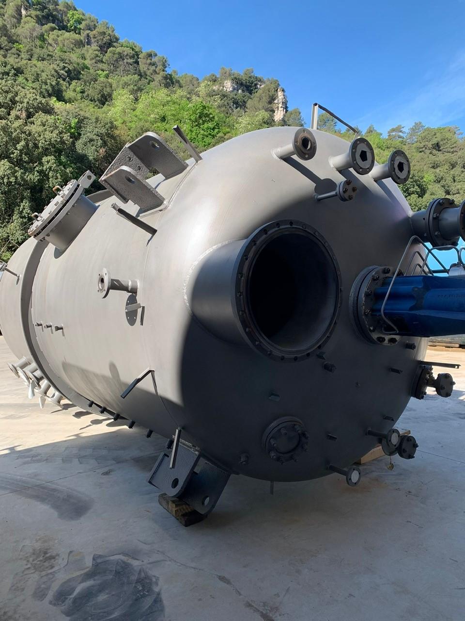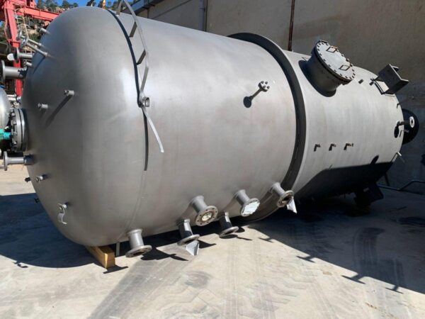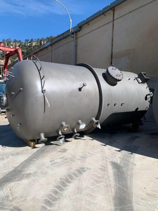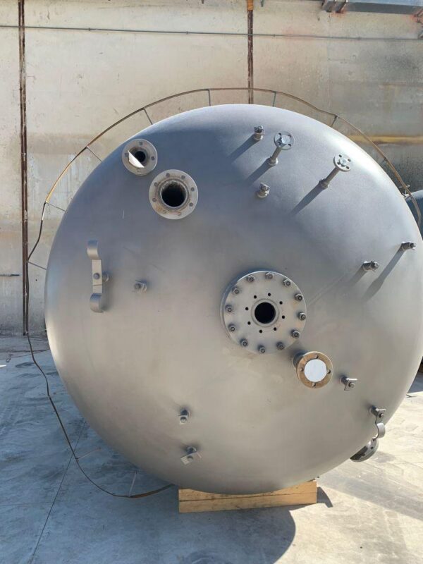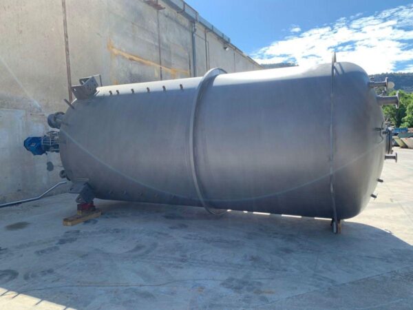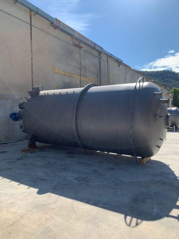 Vertical stainless steel tank with a capacity of 18,500 liters with agitation and internal coil. Top Klopper head with central stirring flange, manhole, sight glass and flage nozzle. Klopper bottom