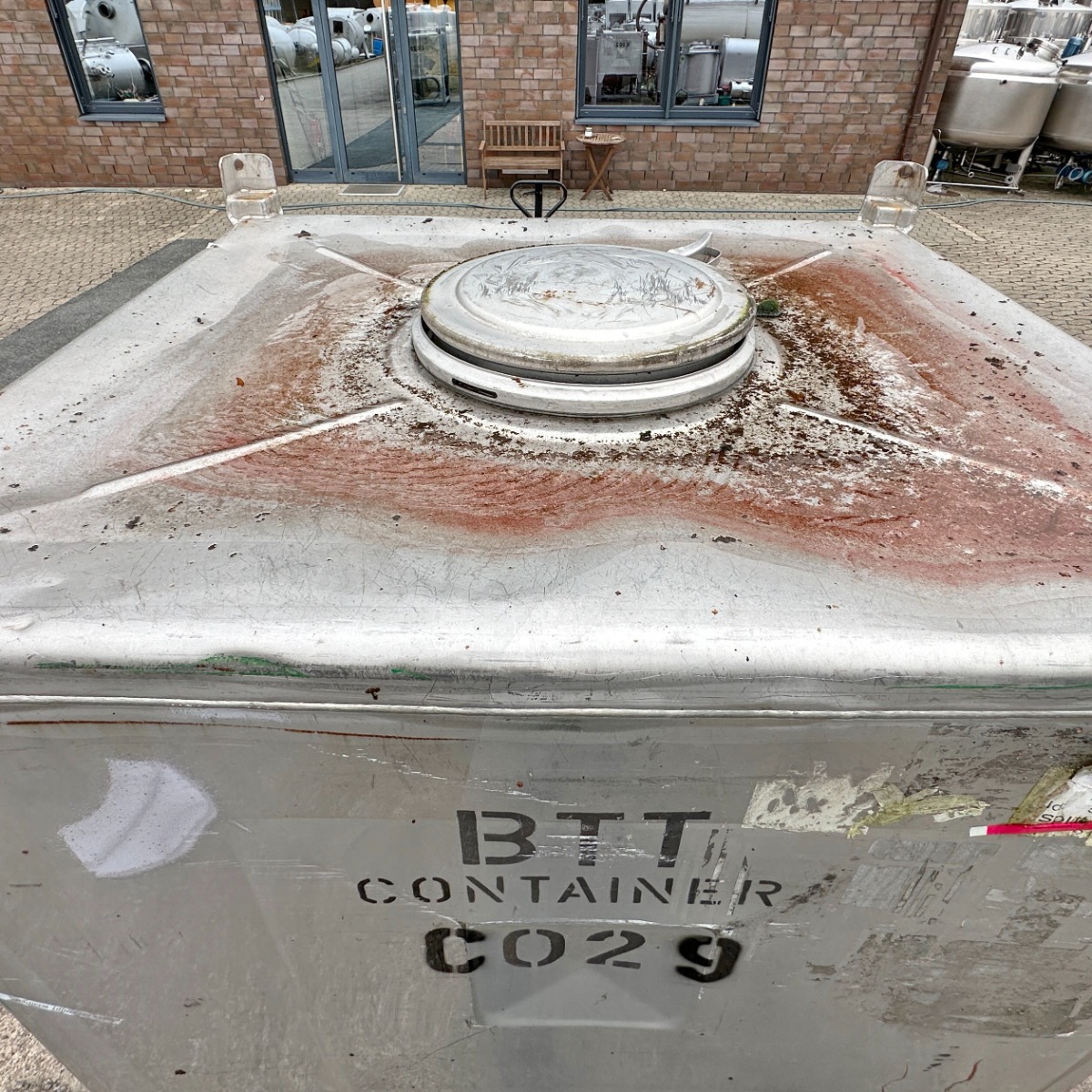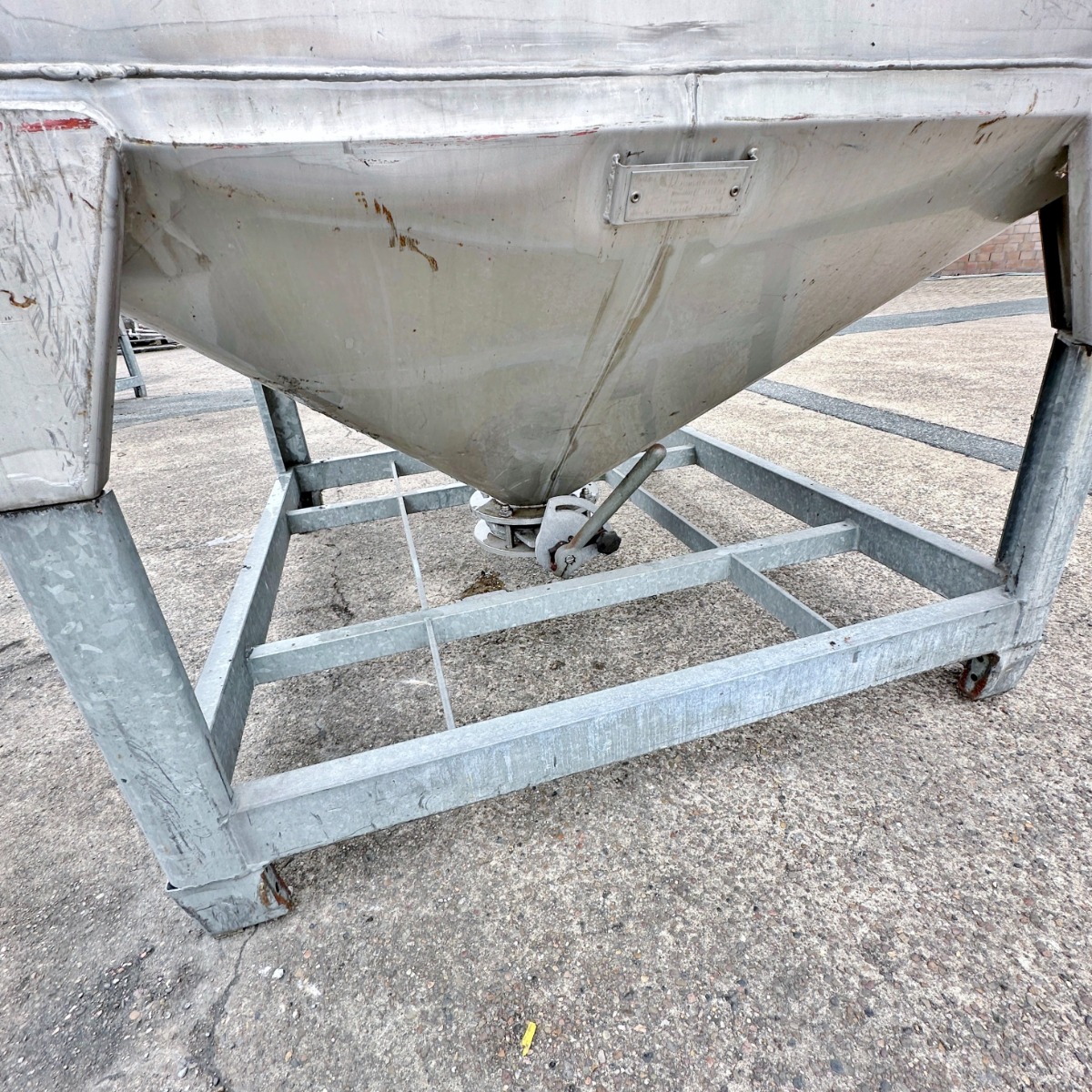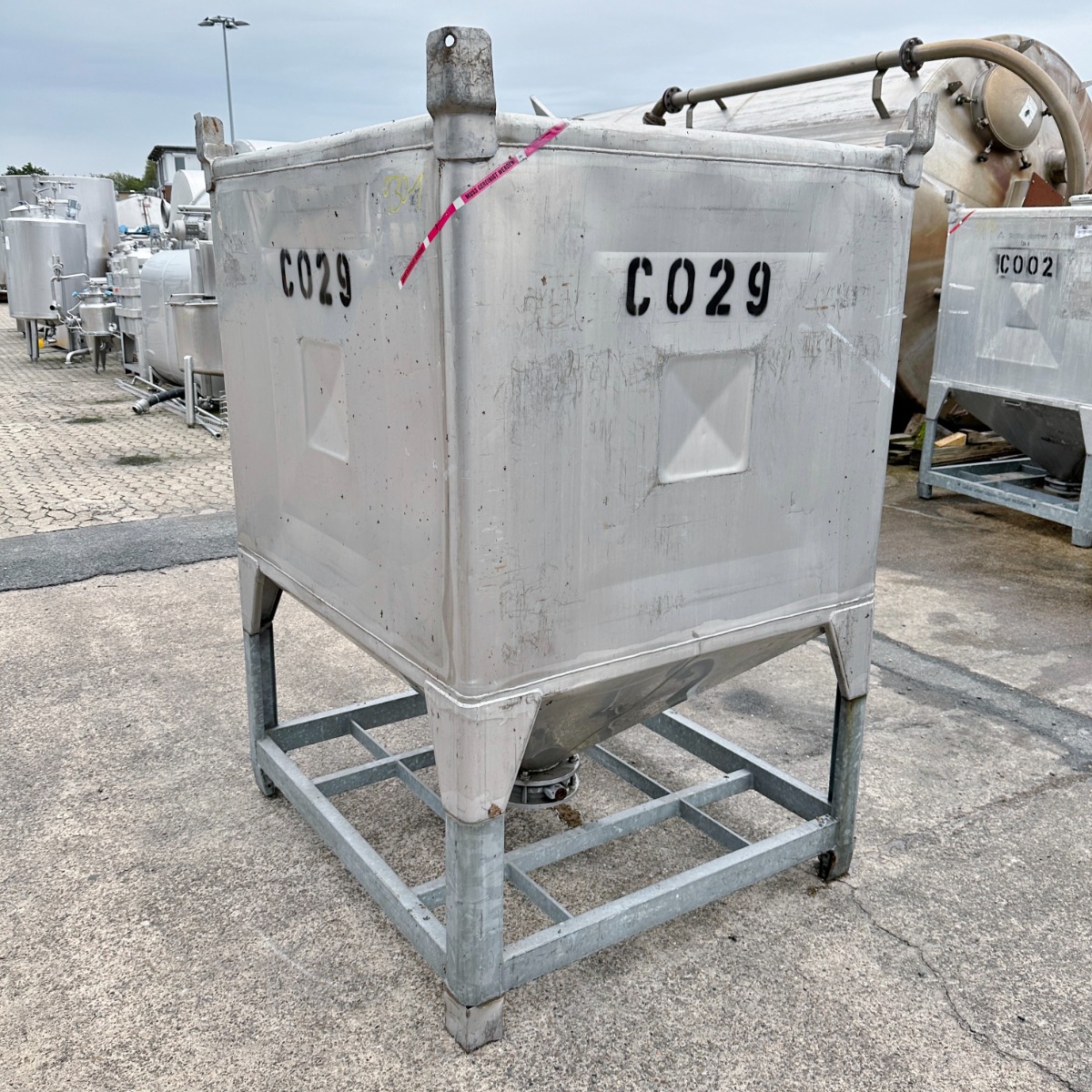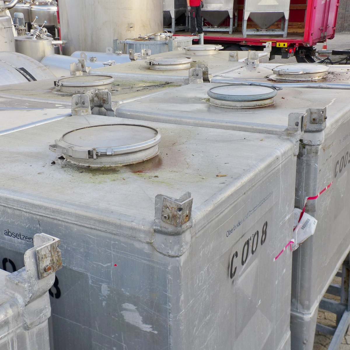 Pharmacy/ Food (Fennel); frame, Fe (galvanized); some dents on the containers; partly the clamping rings of the manholes and the outlet valve are made of Fe; Alternatively, the containers are also