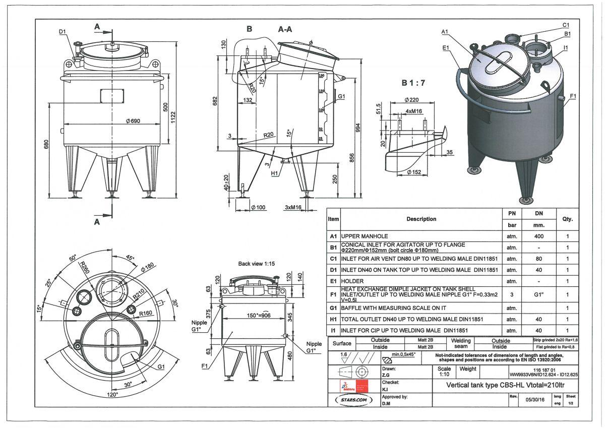 flange for agitator is forseen; article price without agitator; feel free to ask for agitation possibilities on this tank; Ra=<0.8µm