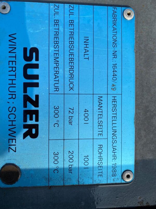 bar; permissible working temperature: 300°C; capacity: 100 liter; chemistry; some residues of previous content; we can’t give any guarantees about the agitator