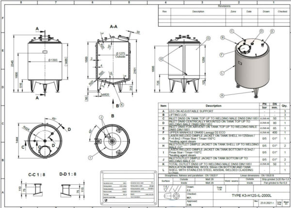 Ångtryck värmeväxlare: 5 Bar Ångtryck värmeväxlare botten: 5 Bar Anslutning värmeväxlare: 1" BSP Anslutning värmeväxlare botten: 1" BSP Arbetstemperatur värmeväxlare cylinder: 150 °C Arbetstemperatur värmeväxlare botten: 150 °C Höjd värmeväxlare: 1.250 mm Kontaktyta botten: 0,30 Kontaktyta cylinder: 4,80 m² Position värmeväxlare: the complet cilinder Typ av värmeväxlare på cylinder: dimple-jacket Typ av värmeväxlare på botten: dimple-jacket Vattentryck värmeväxlare: 5 Bar Vattentryck värmeväxlare botten: 5 Bar