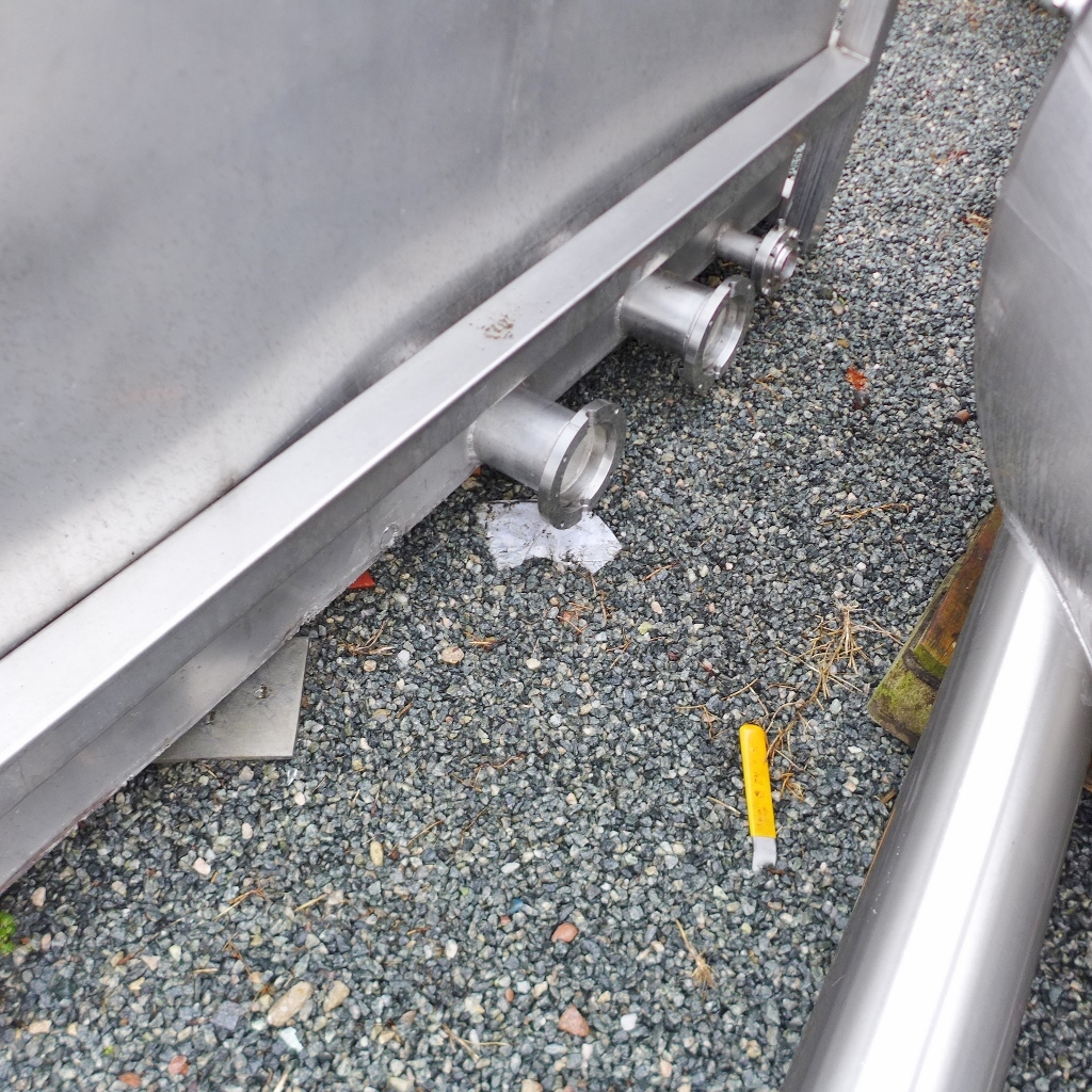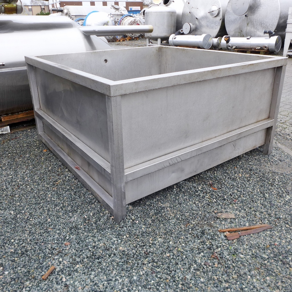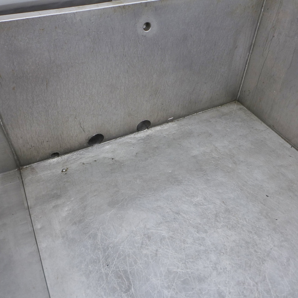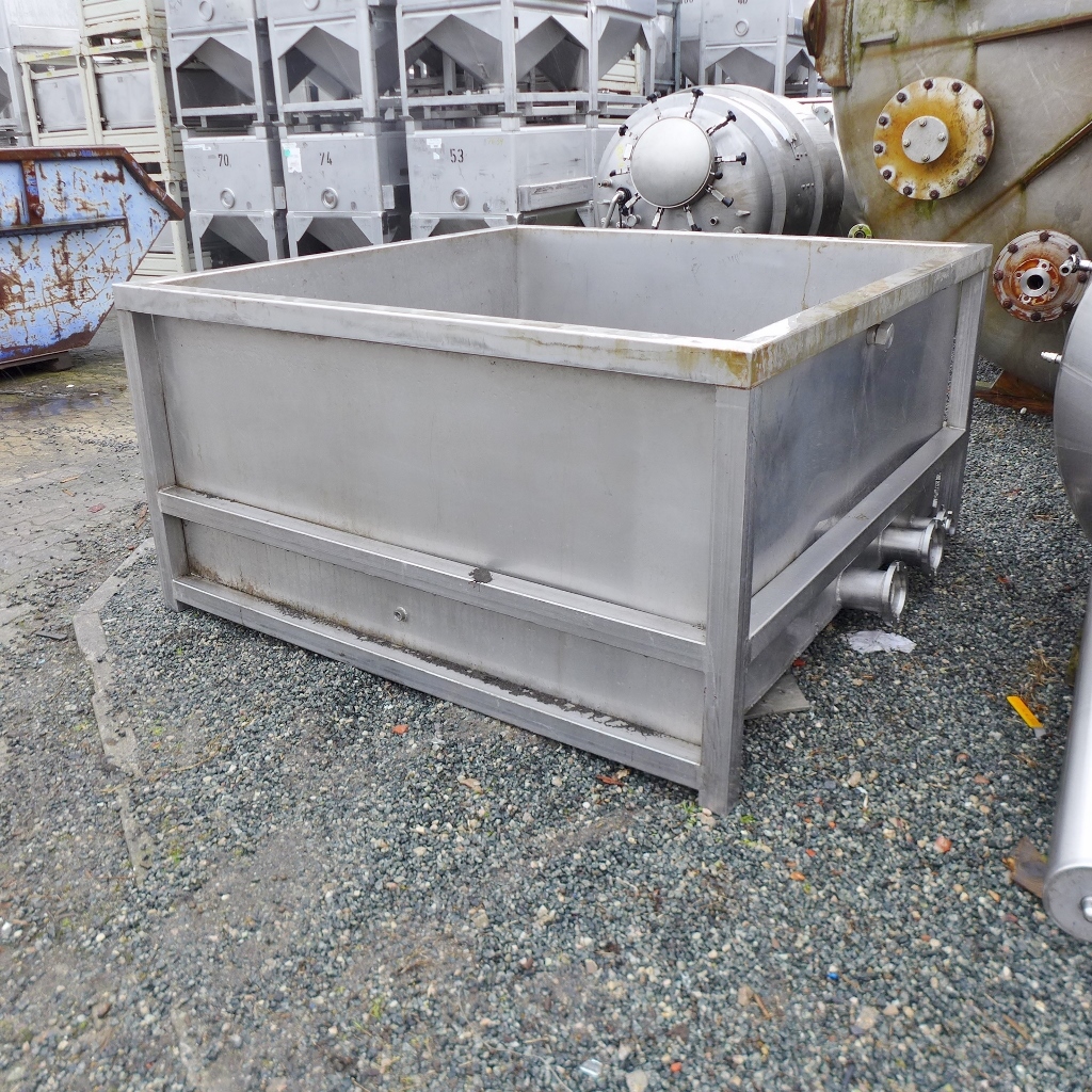 Additional information: Food industry; 4-legged frame, Aisi 304; Basic dimensions inside approx. 1,574 x 1,588 mm; interior height approx. 800 mm; Outlets: 2 x DN 100 (probably formerly with butterfly valve), 1 x DN 50 (with butterfly valve; without hand lever)