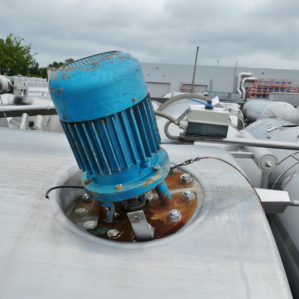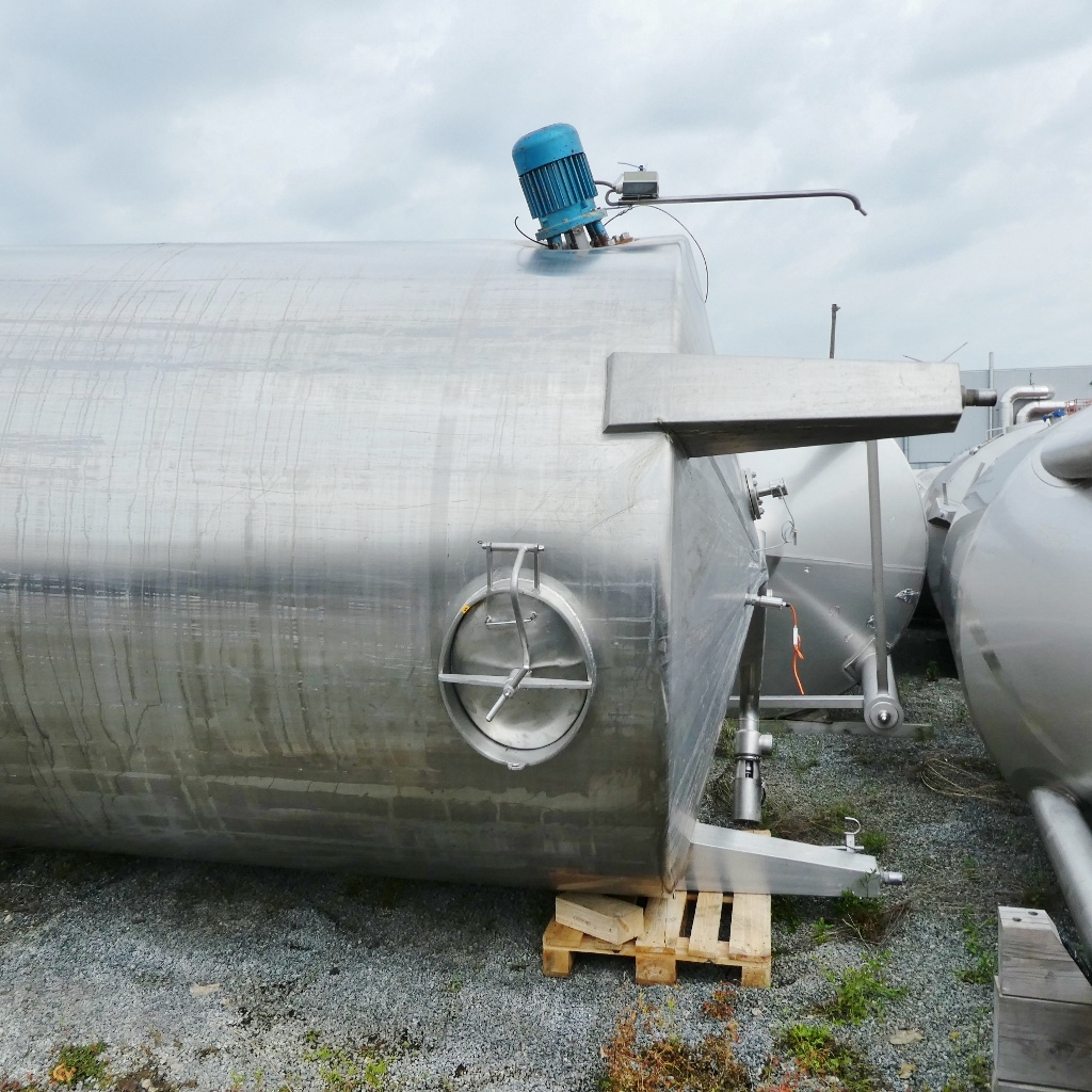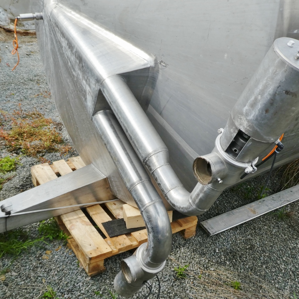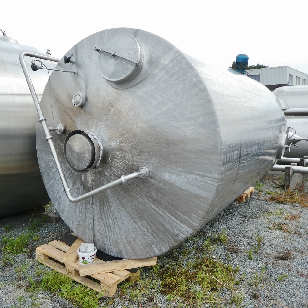 Additional information: Dairy; Manhole upper bottom diameter appr. 420 mm, manhole cylinder appr. 410 x 510 mm; some residues of previous content; pipe end cut flush; Metallic discolouration inside Volumetric volume (L): 20.000 L Pressure in tank: ATM - atmosferic Material wet parts: SS AISI 304 (V2A) Model: vertical Configuration: single-skin Heat exchanger: no Insulation: no Mobile tank: no Total discharge: yes Documents included: no Technical drawing included: no Registration plate on the tank: no Flange for agitator: no Outlet of tank: available Agitator: yes Number of revolutions: 940 Power: 2 Internal diameter tank: 2.490 mm Cylinder height: 4.050 mm Total height of tank: 5.650 mm