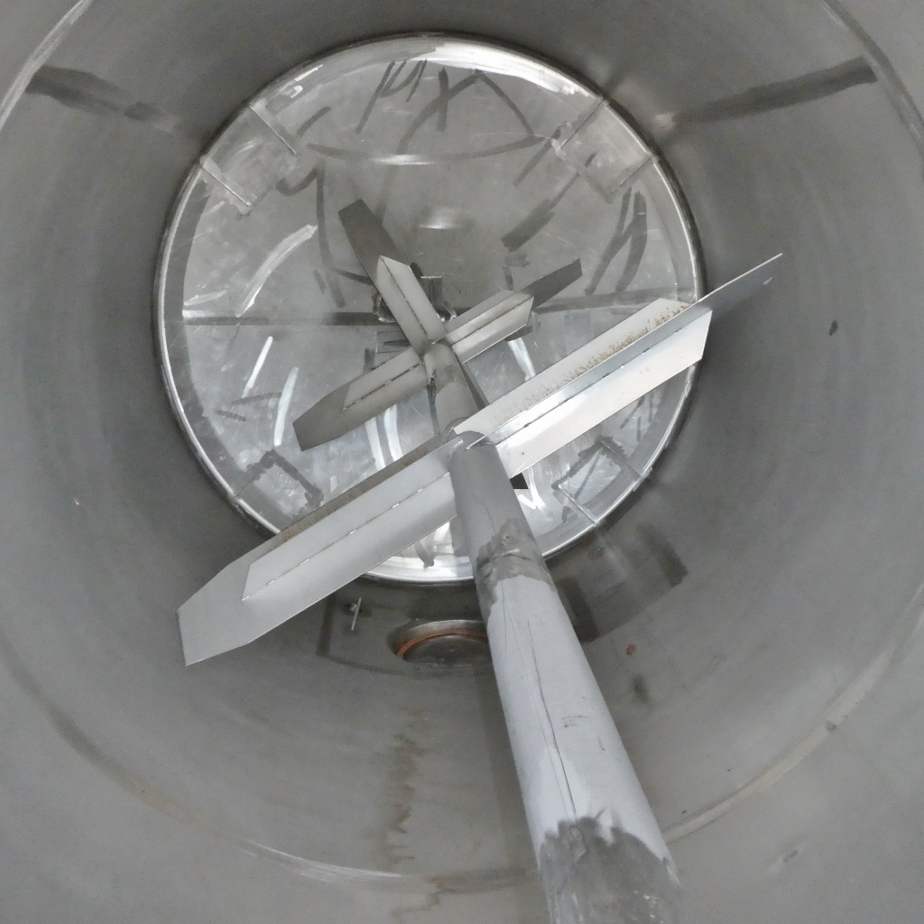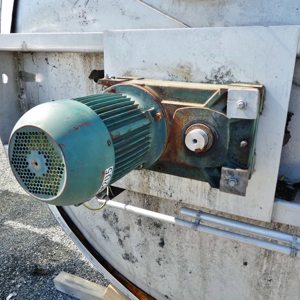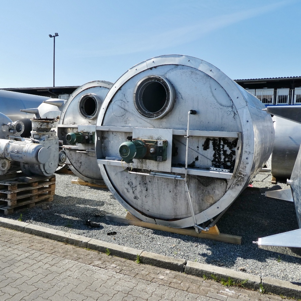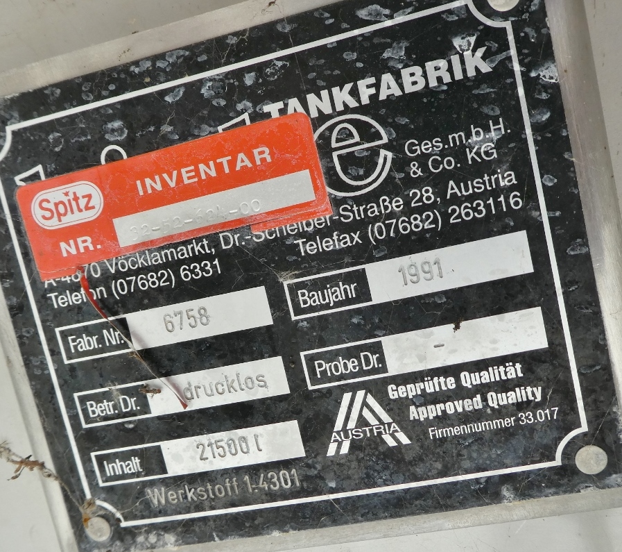 Additional information: fruit juice industry; small sheet metal cutouts in the insulation jacket; ventilation hoods no longer present in the upper bottom; dents at the insulation jacket; pipe end cut flush Volumetric volume (L): 21.500 L Pressure in tank: ATM - atmosferic Material wet parts: SS AISI 304 (V2A) Model: vertical Configuration: insulated Heat exchanger: no Insulation: yes Mobile tank: no Total discharge: yes Documents included: no Technical drawing included: no Registration plate on the tank: yes Flange for agitator: no Position of manway: cylinder Outlet of tank: 80 Agitator: yes Power: 7,50 Internal diameter tank: 2.590 mm Outer diameter tank: 2.800 mm Cylinder height: 4.100 mm Total height of tank: 6.200 mm