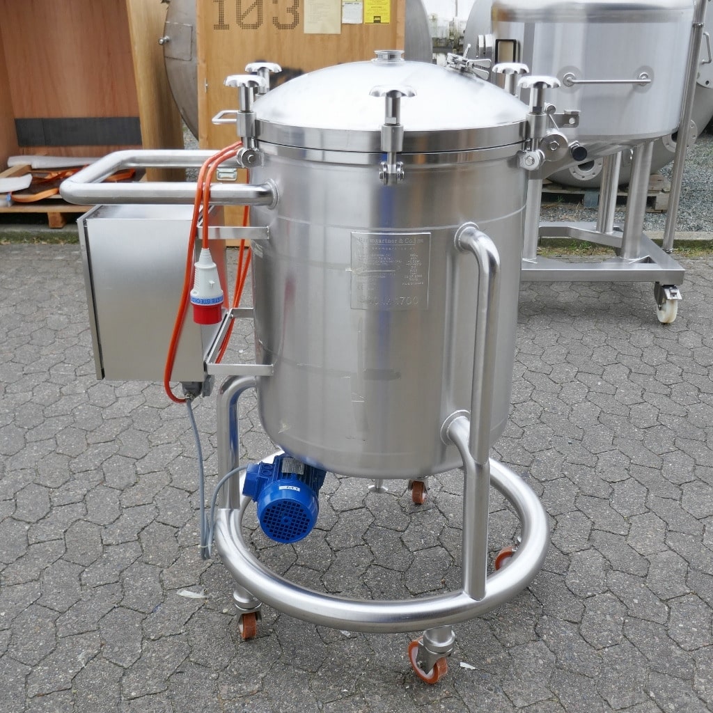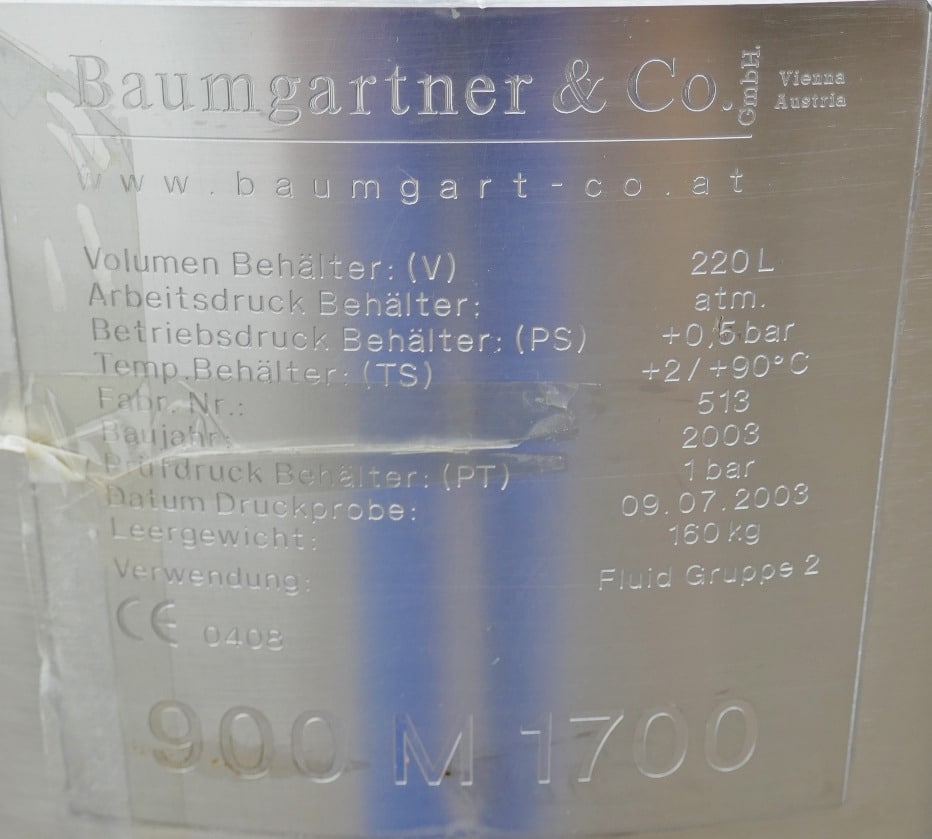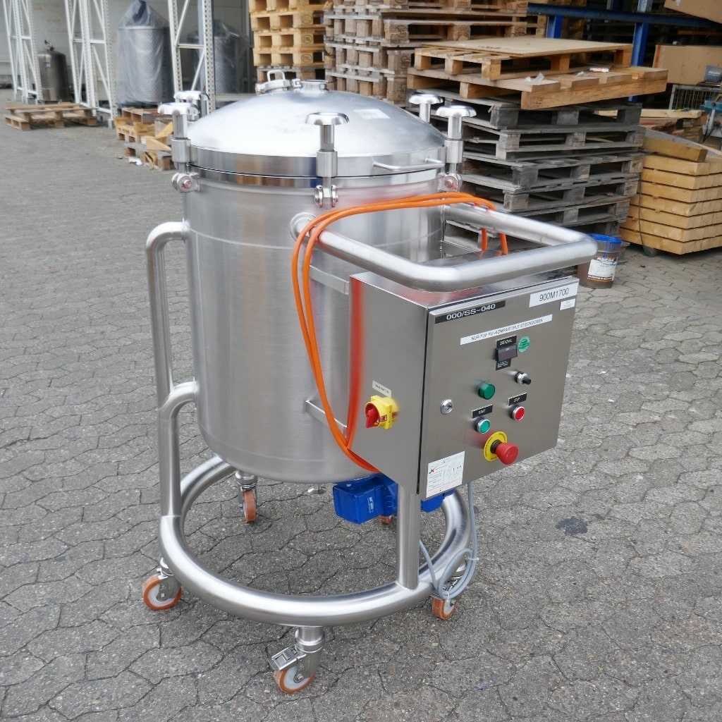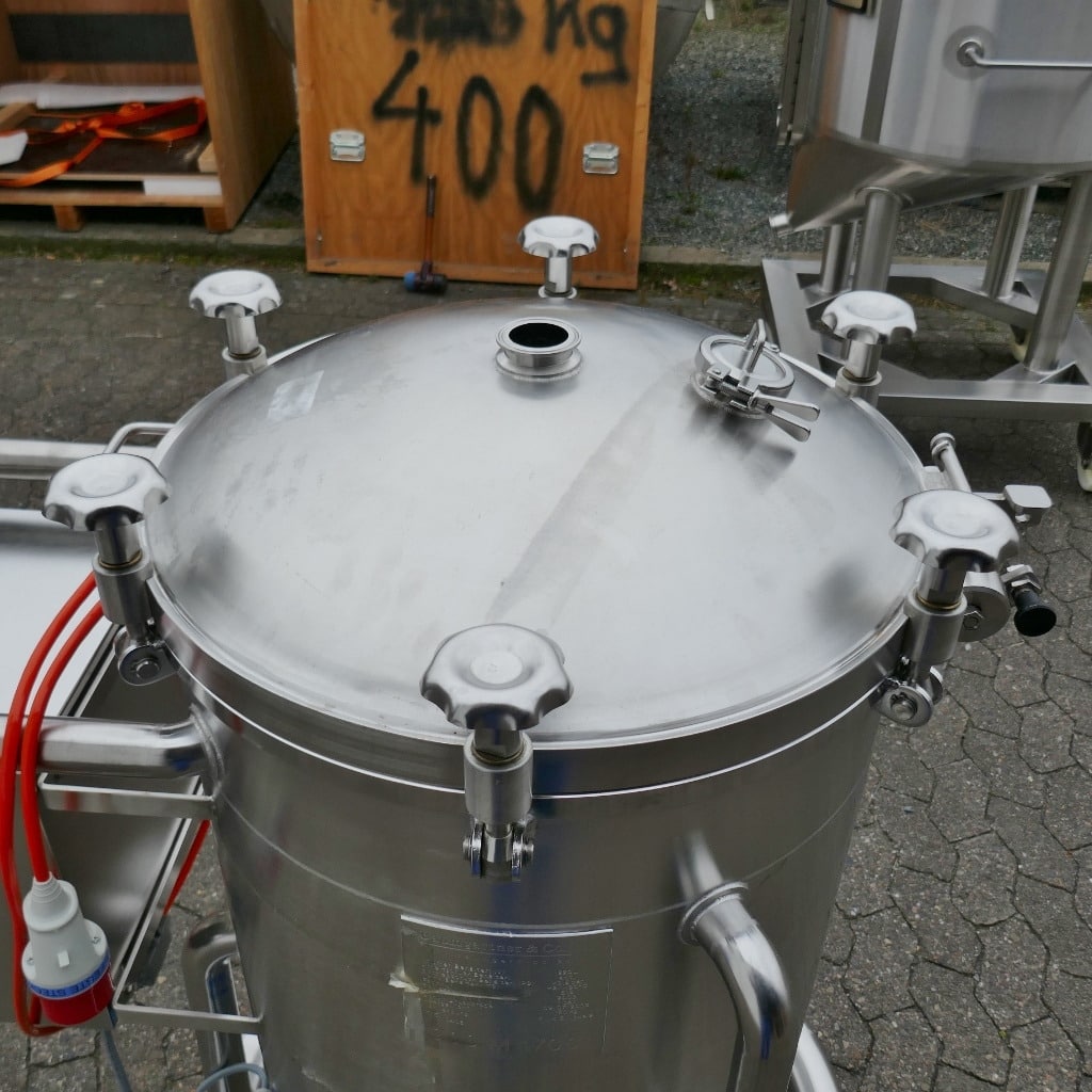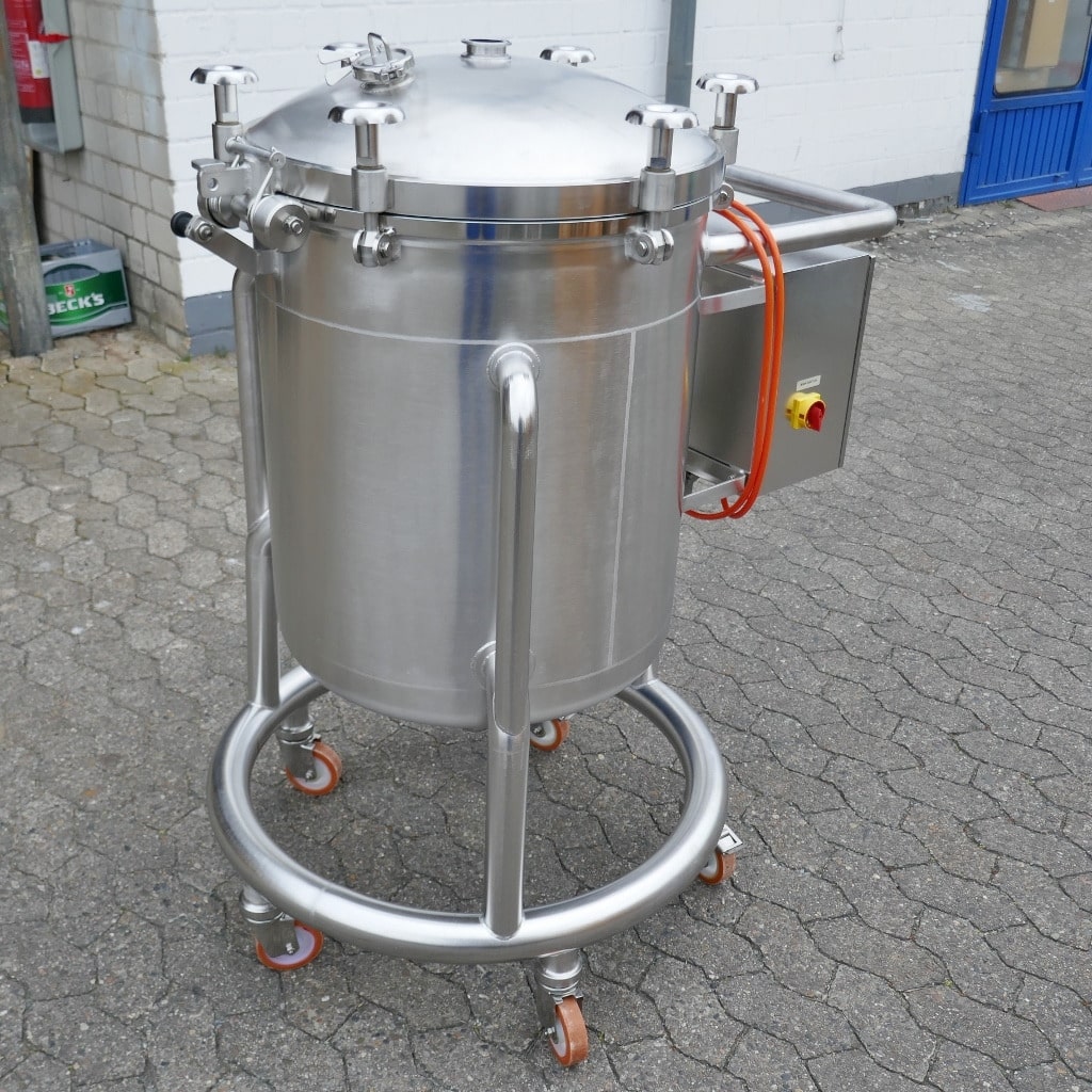 Additional information: Pharmacy; Mobile stainless steel frame with 5 wheels; outlet with screwed-on reducer Volumetric volume (L): 220 L Pressure in tank: pressure Max. pressure (Bar): 0,50 Bar Max. temperature (°C): 90 °C Material wet parts: SS AISI 316 (V4A) Model: vertical Configuration: single-skin Heat exchanger: no Insulation: no Mobile tank: no Total discharge: yes Documents included: no Technical drawing included: no Registration plate on the tank: yes Flange for agitator: no Outlet of tank: 50 Agitator: yes Power: 0,37 Cylinder: 5 mm Bottom: 5 mm Internal diameter tank: 600 mm Cylinder height: 630 mm Total height of tank: 1.380 mm Empty weight tank: 280