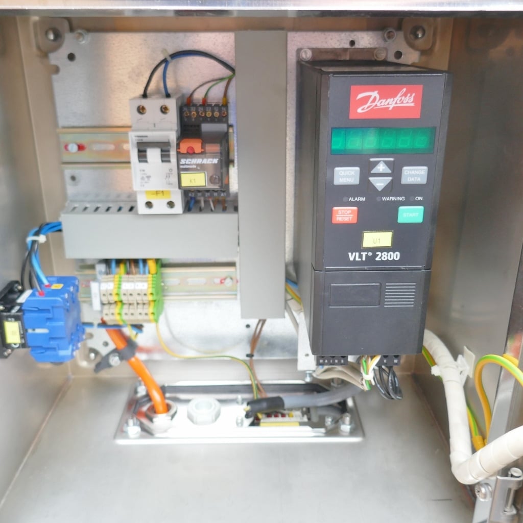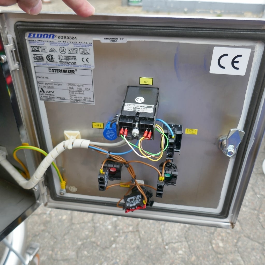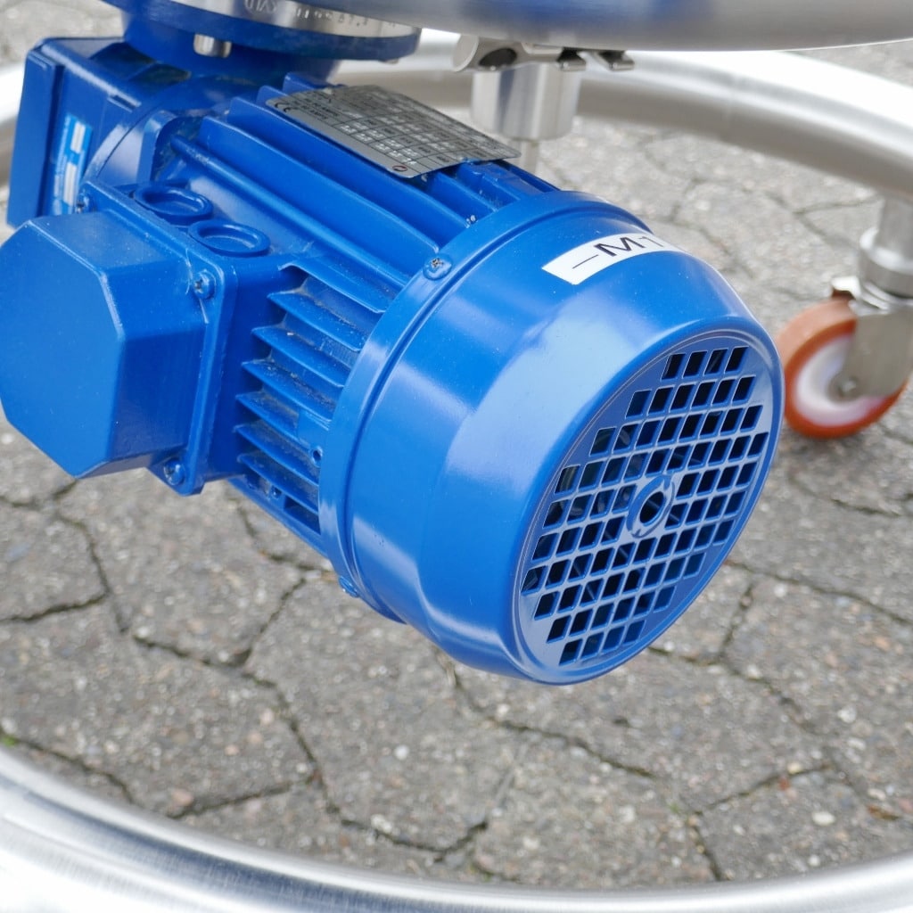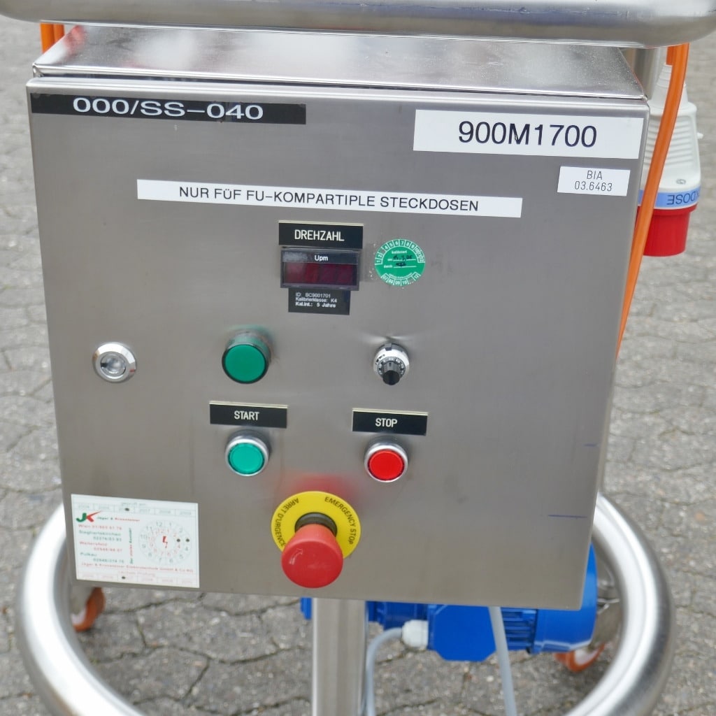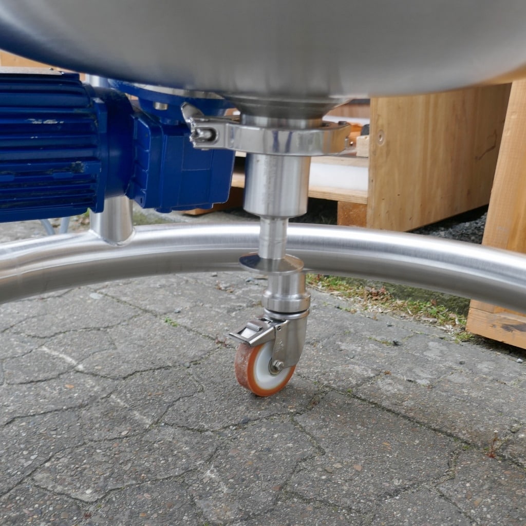 Additional information: Pharmacy; Mobile stainless steel frame with 5 wheels; outlet with screwed-on reducer Volumetric volume (L): 220 L Pressure in tank: pressure Max. pressure (Bar): 0,50 Bar Max. temperature (°C): 90 °C Material wet parts: SS AISI 316 (V4A) Model: vertical Configuration: single-skin Heat exchanger: no Insulation: no Mobile tank: no Total discharge: yes Documents included: no Technical drawing included: no Registration plate on the tank: yes Flange for agitator: no Outlet of tank: 50 Agitator: yes Power: 0,37 Cylinder: 5 mm Bottom: 5 mm Internal diameter tank: 600 mm Cylinder height: 630 mm Total height of tank: 1.380 mm Empty weight tank: 280