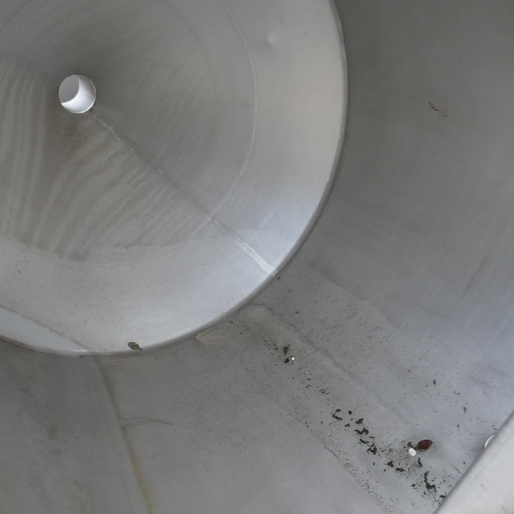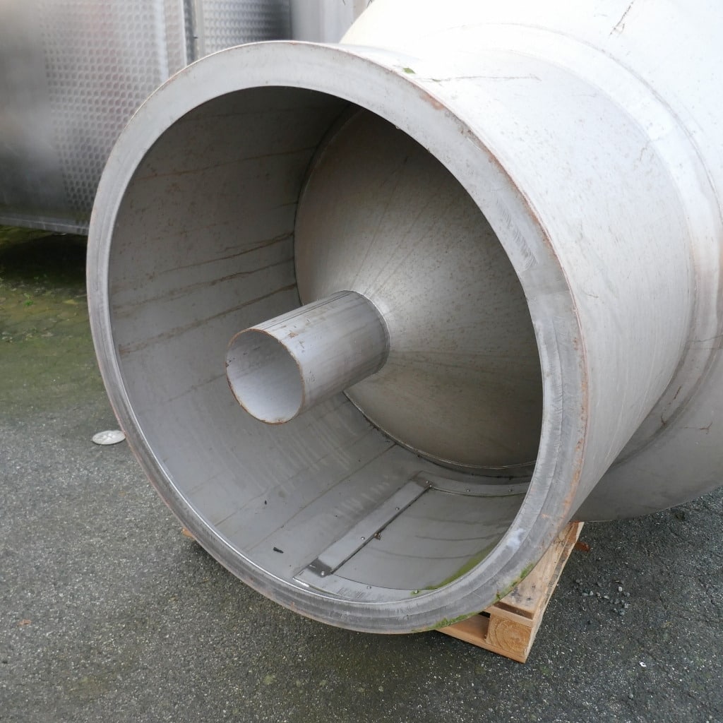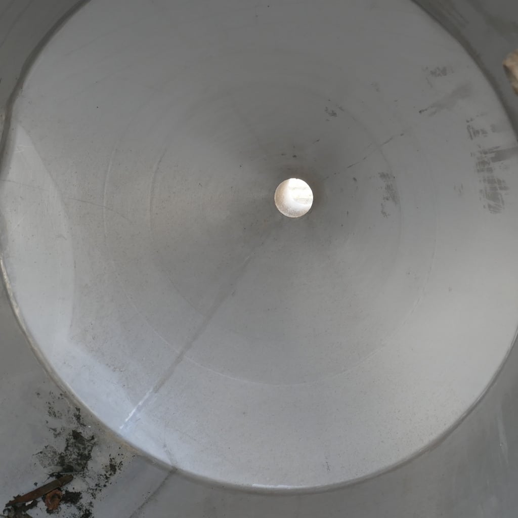 1 welded stainless steel bar over the tank opening; 1 tank with 1 dent in the cylinder/cone base transition (see photos); pipe end cut flush