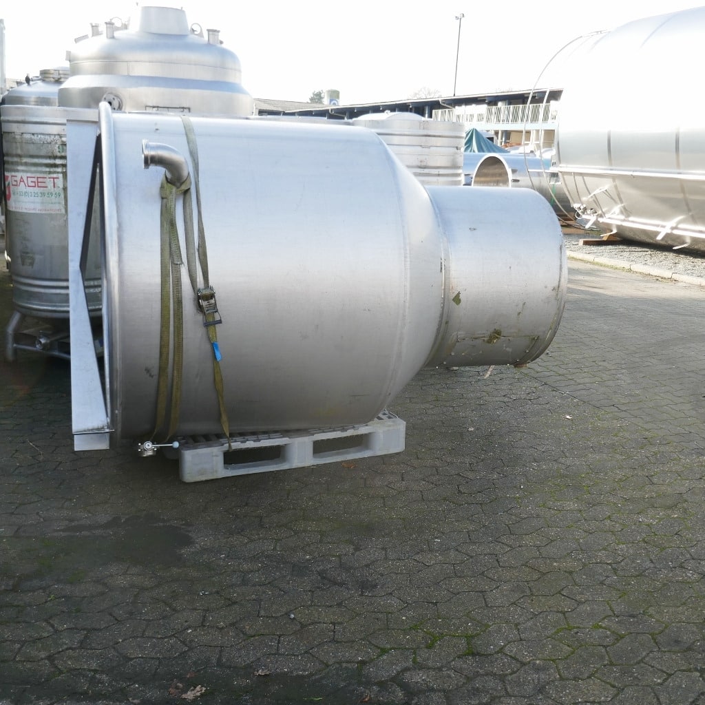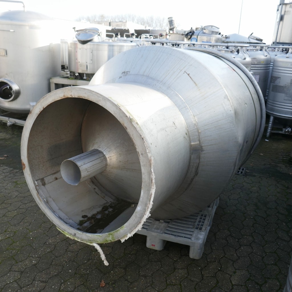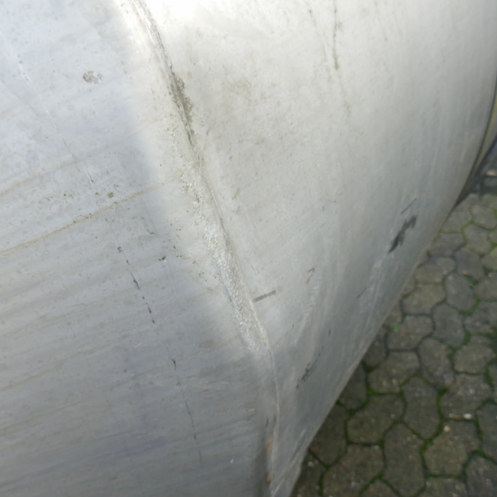 1 welded stainless steel bar over the tank opening; 1 tank with 1 dent in the cylinder/cone base transition (see photos); pipe end cut flush