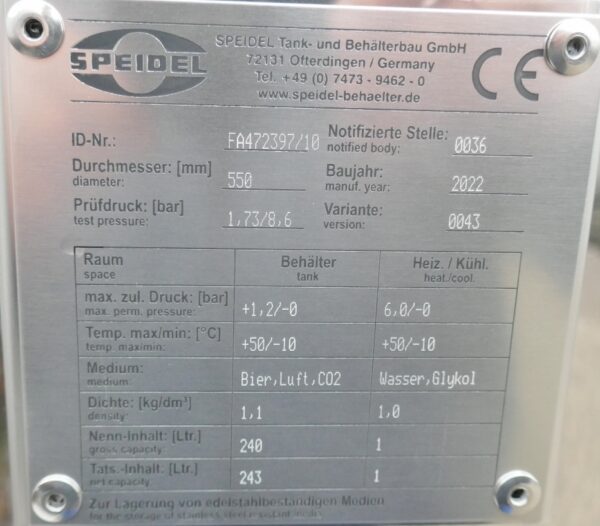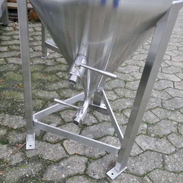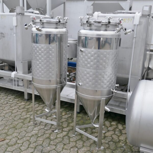 Brewery; Thermoplate, Aisi 304 around most of the cylinder; cone height appr. 500 mm; 1 tank with metallic discoloration in the outlet area inside (see photos)