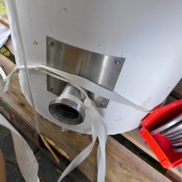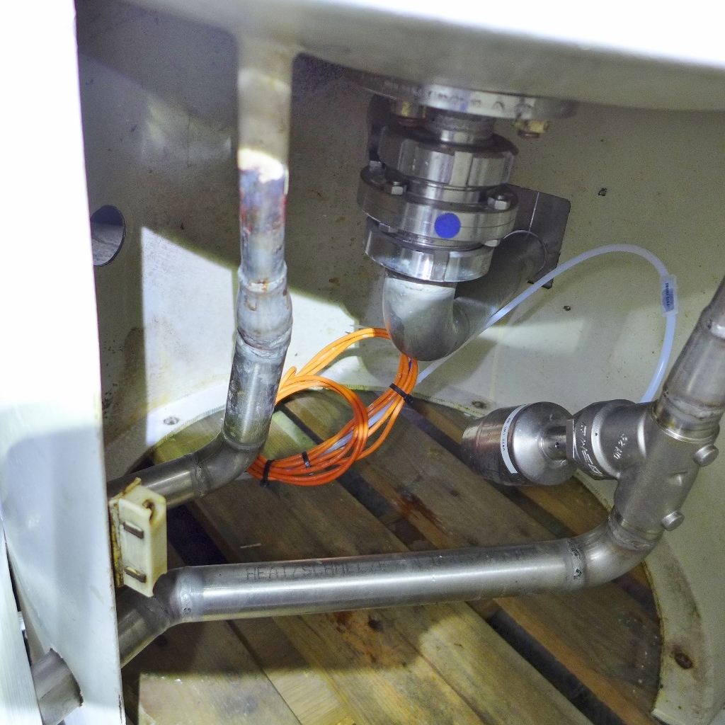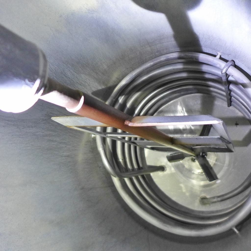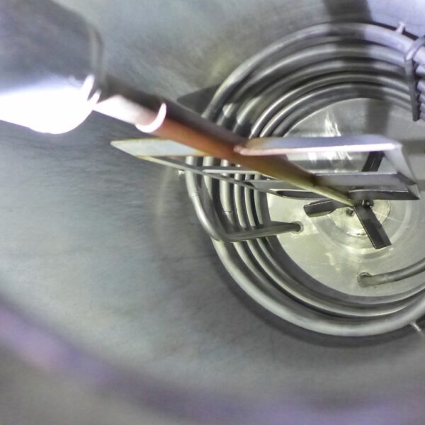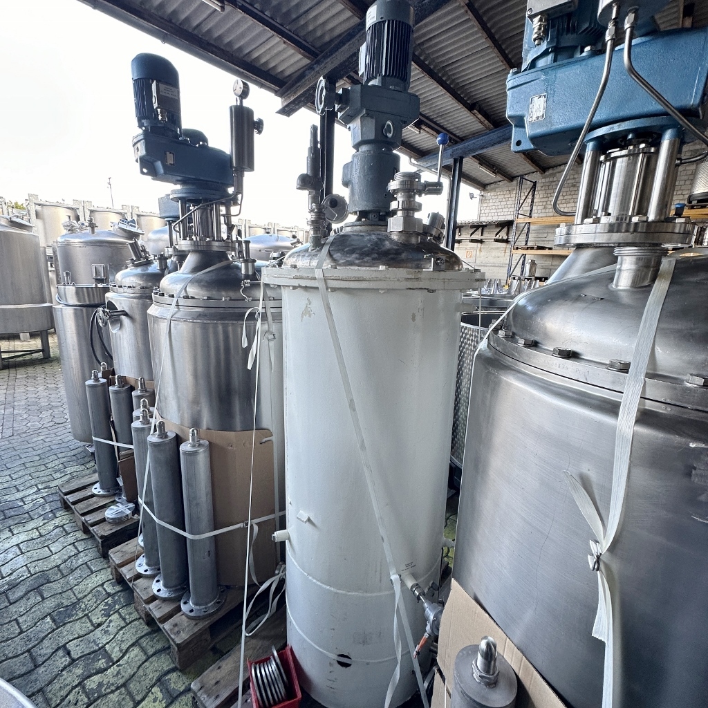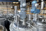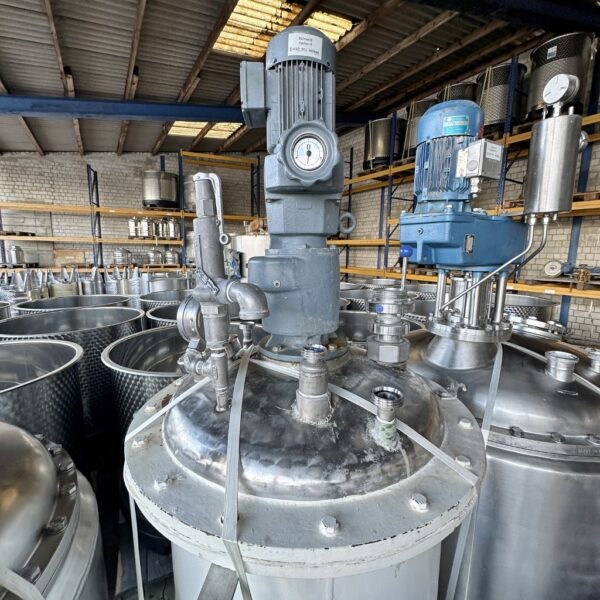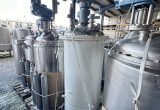 Pharmacy; Double jacket for heating and cooling made of Fe; Full pipe coil for heating/cooling made of Aisi 304; Stand frame made of Fe; some residues of previous content; we can’t give any