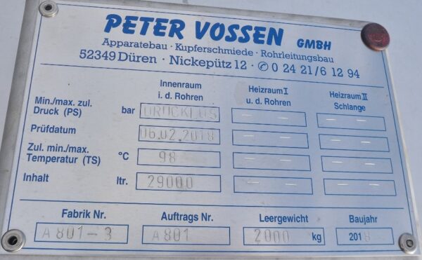 Cosmetics; Storage tank was manufactured according to WHG guidelines (WHG certificate available); Wall thickness cylinder: lower half 4 mm; upper half: 3 mm; Screws for mounting load cells (no
