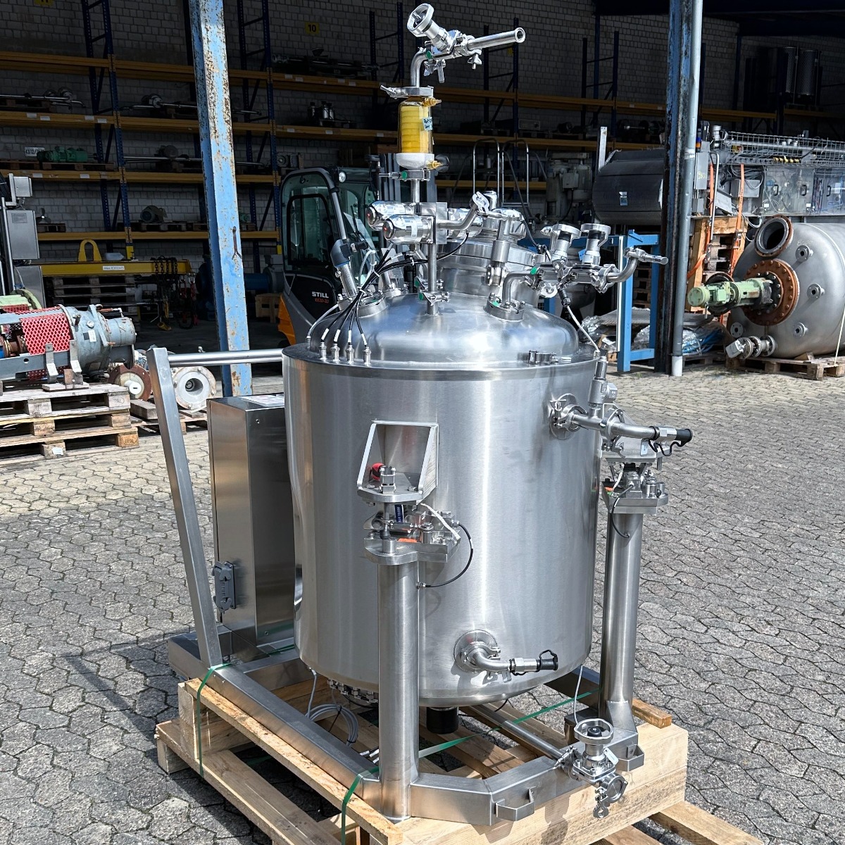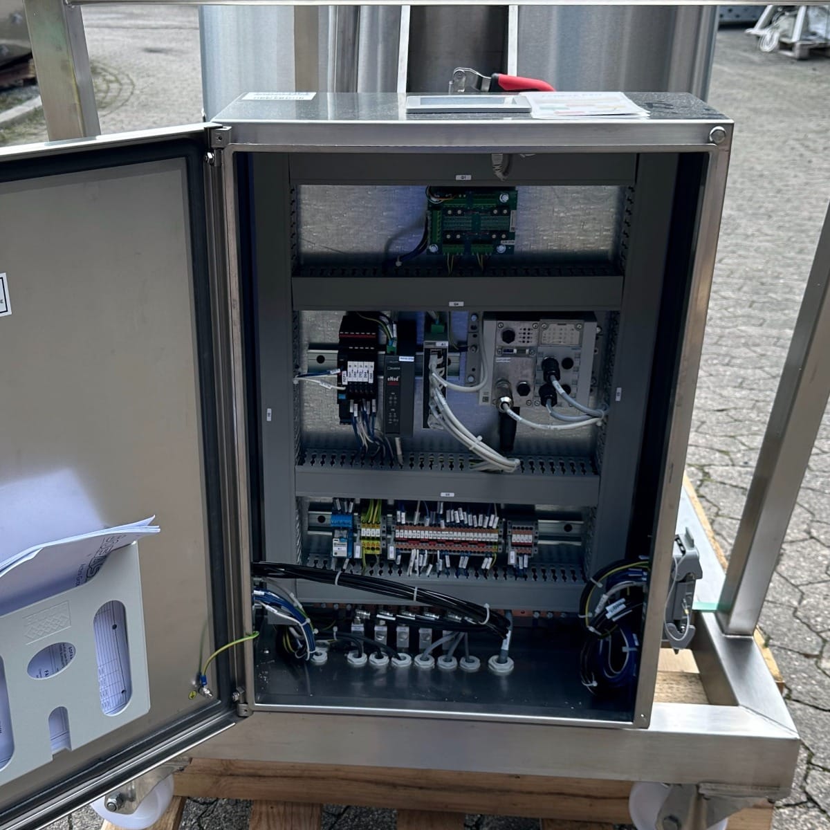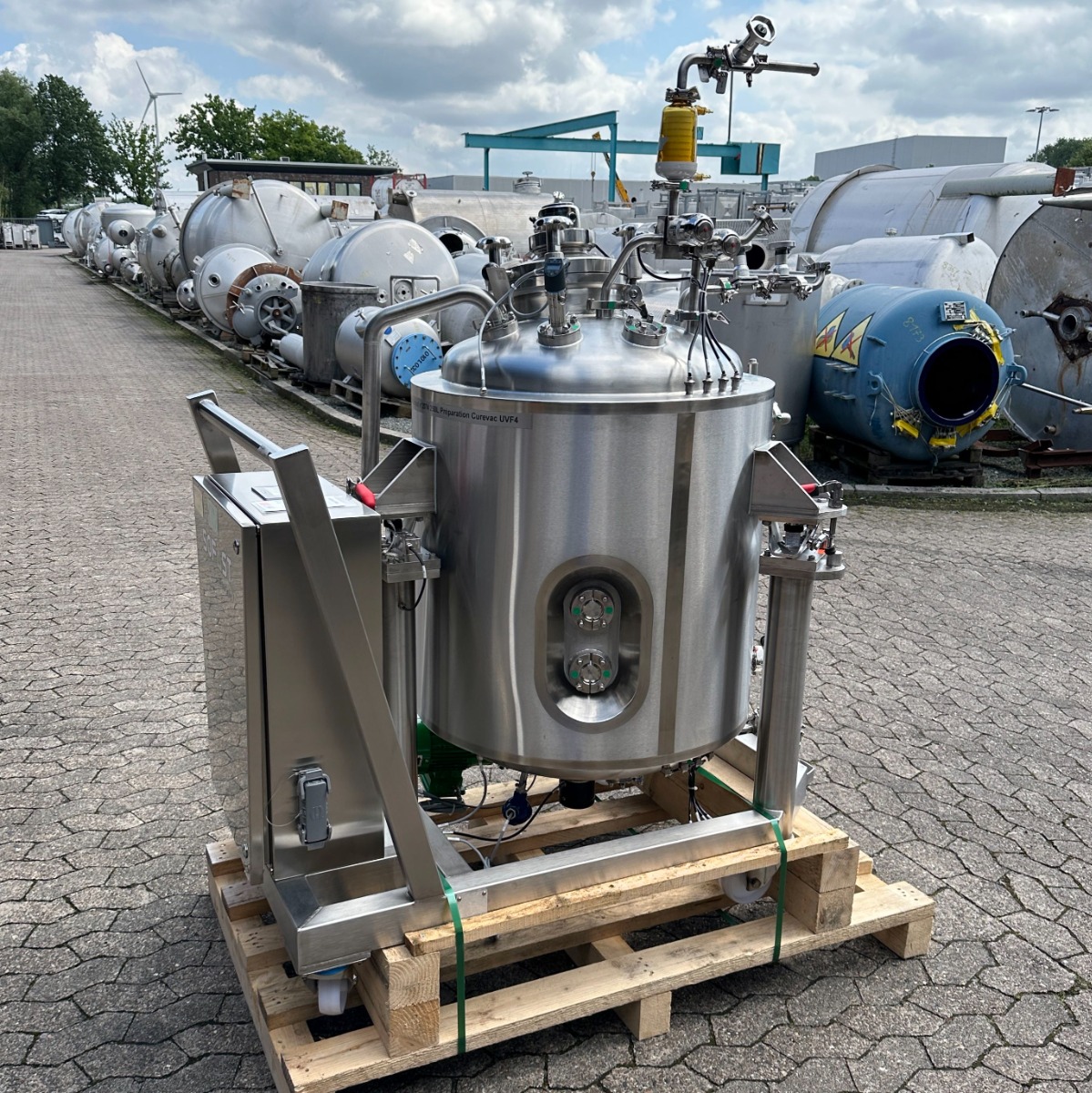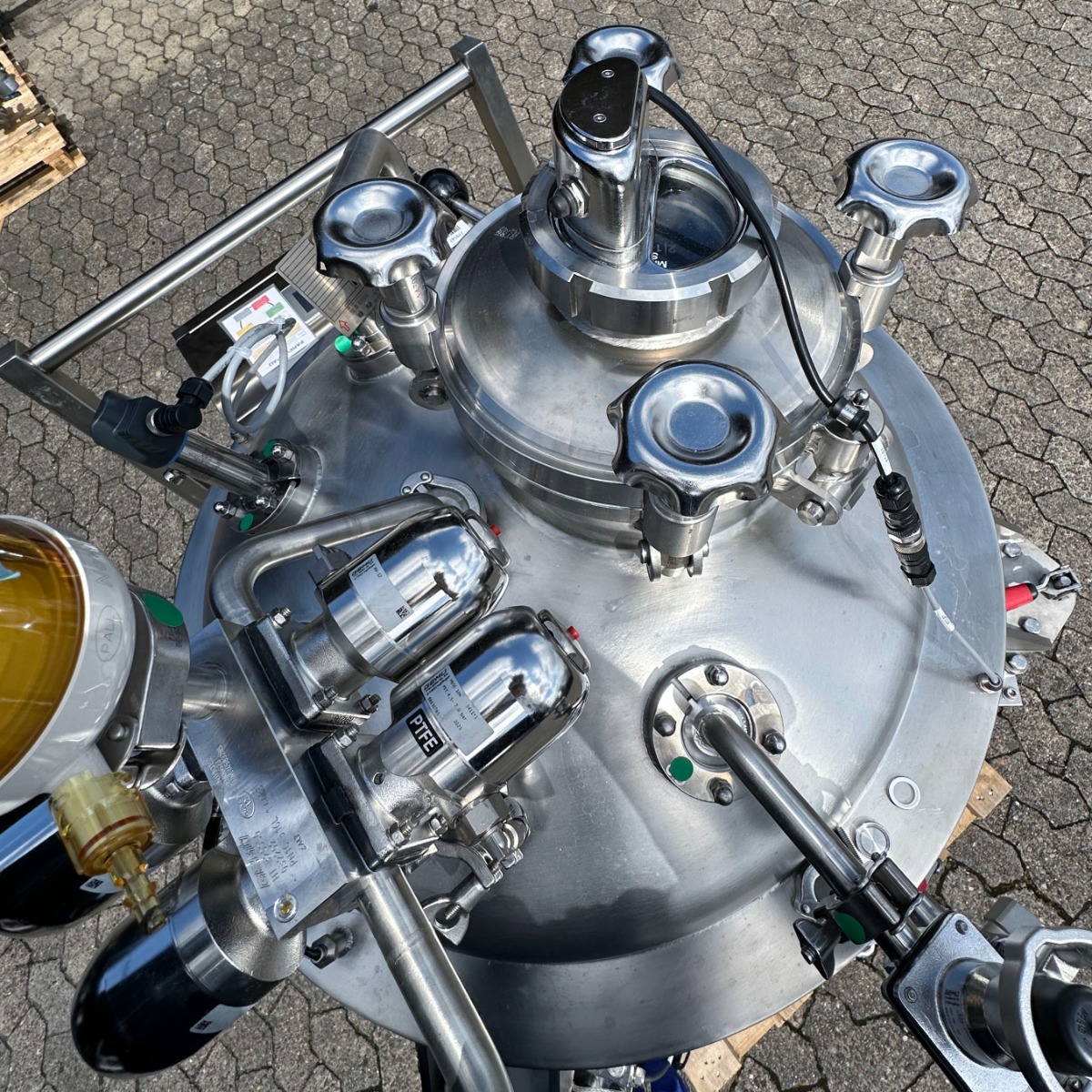 pharmacy; mobile frame V2A with brake; hand hole with sight glass diameter: approx. 250mm; pneumatic actuator at the outlet; the container hangs on 3x weighing cells on the frame; we can’t give any