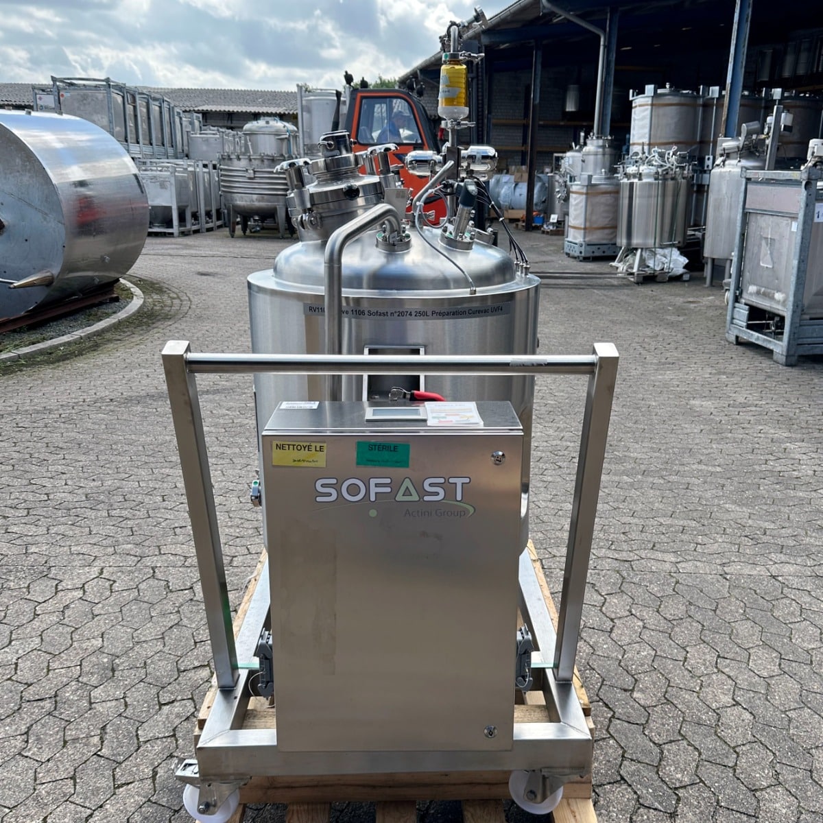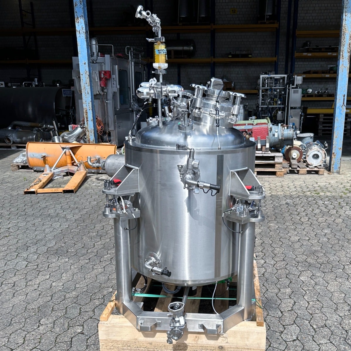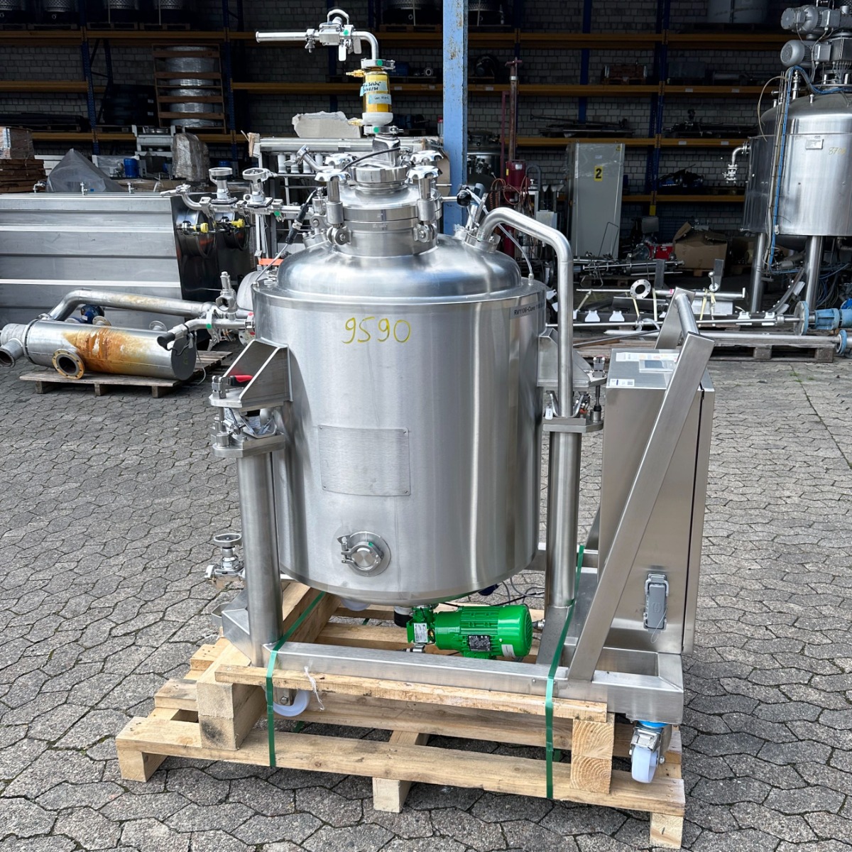 pharmacy; mobile frame V2A with brake; hand hole with sight glass diameter: approx. 250mm; pneumatic actuator at the outlet; the container hangs on 3x weighing cells on the frame; we can’t give any