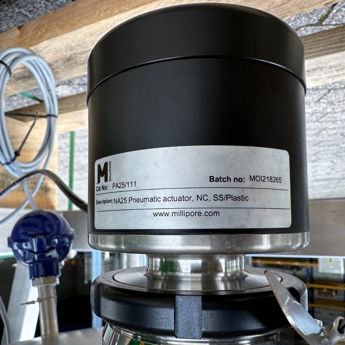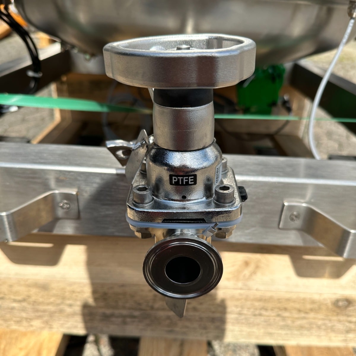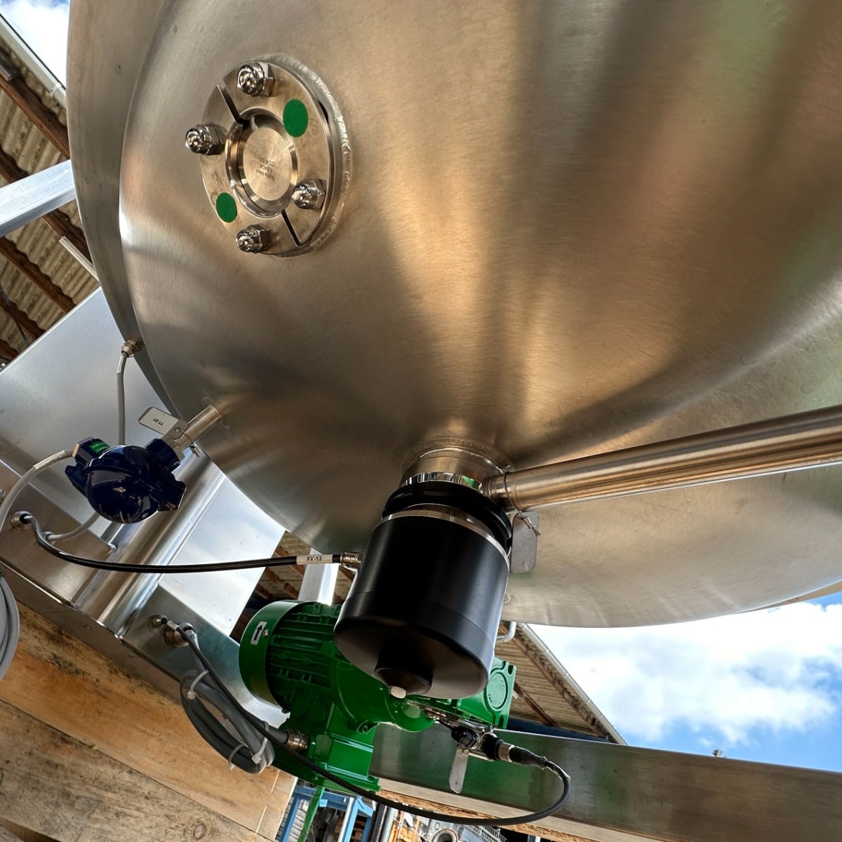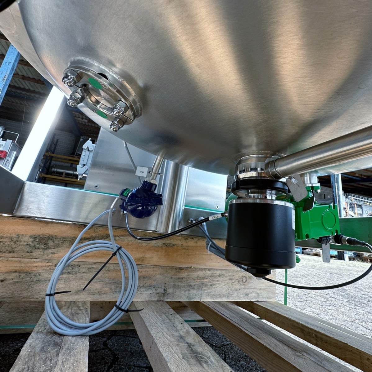 pharmacy; mobile frame V2A with brake; hand hole with sight glass diameter: approx. 250mm; pneumatic actuator at the outlet; the container hangs on 3x weighing cells on the frame; we can’t give any
