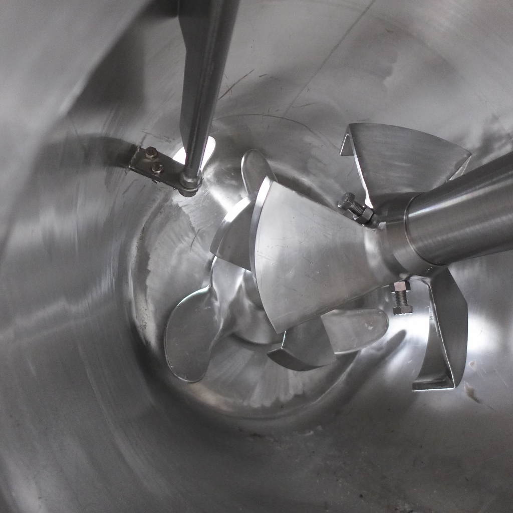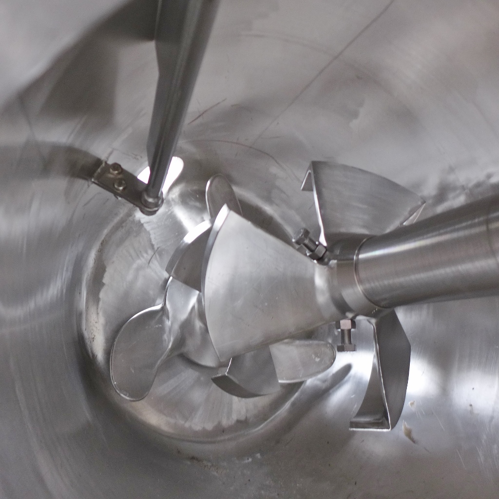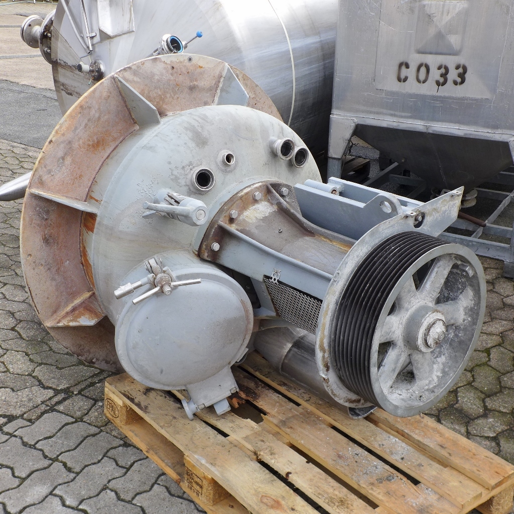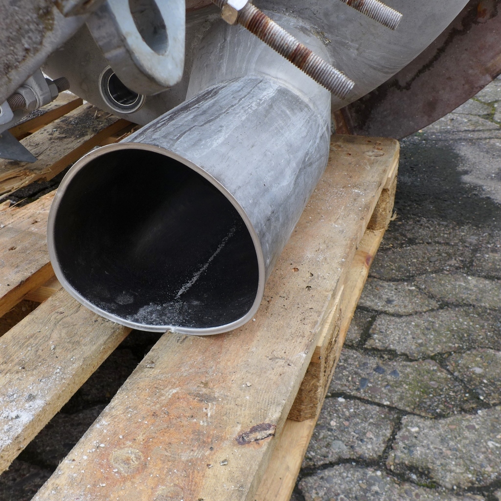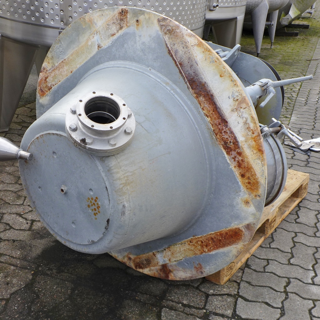 Powder mixer in the food industry; Manhole diameter approx. 410 mm; Support ring and plate on the outside of the lower bottom made of Fe; Grayish protective coating on the outside; we can’t give any