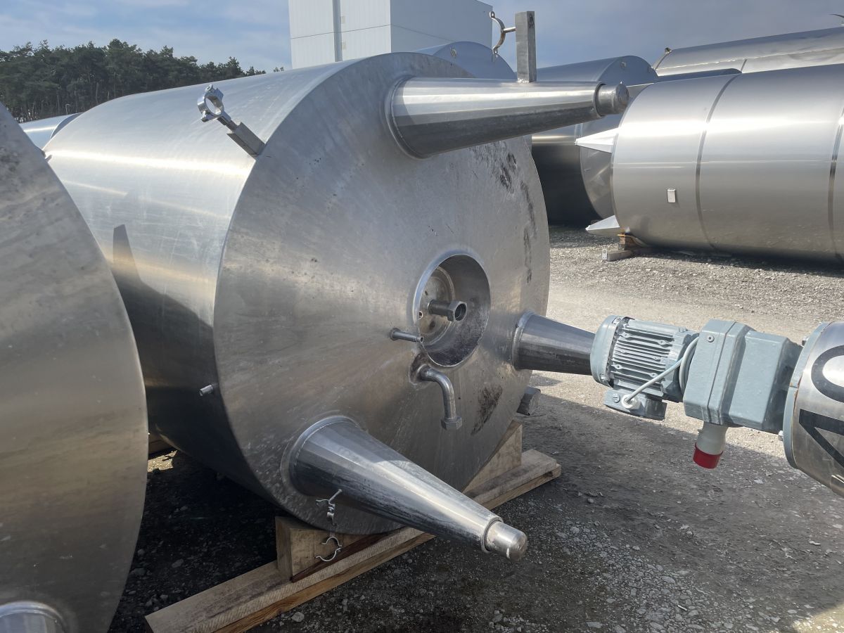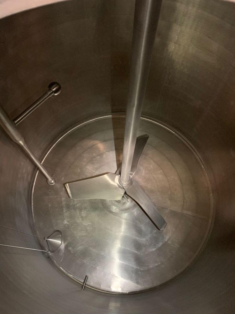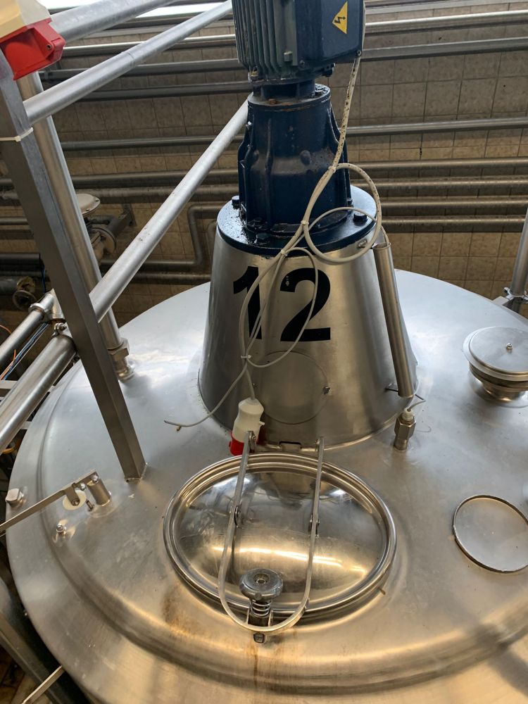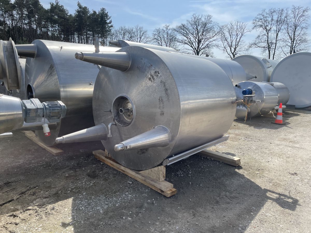 Article type: second-hand mixing tank Additional information: we can’t give any guarantees about the heating/cooling jacket; we can’t give any guarantees about the agitator Volumetric volume (L): 3.000 L Pressure in tank: ATM - atmosferic Material wet parts: SS AISI 304 (V2A) Model: vertical Configuration: insulated with heat-exchanger Heat exchanger: yes Insulation: yes Mobile tank: no Top type: conical Shape of tank: cylindrical Bottom type: conical Bottom outlet: yes Total discharge: yes Fixation points: 3 adjustable feet Type of HE on the cylinder: half pipe welded onto the outside of the innertank Position HE: the complet cilinder Type of HE on the bottom: half pipe welded onto the outside of the innertank Manway(s): RVS 304 Gasket manway(s): unknown Fixation point(s): RVS 304 Suitable for food industry: yes Documents included: no Technical drawing included: no Registration plate on the tank: no Flange for agitator: no Number of manways: 1 Position of manway: at the top Height manhole 1 (mm): 350 mm x H 440 mm Hinged lid: yes Tank outlet: inside Ø 50 mm Agitator: yes Agitator type: propeller agitator Position engine: at the top Power: 2 Voltage: 380 V - three-phase Current: 3,70 Distance from outlet to ground: 700 mm Outer diameter tank: 1.700 mm Cylinder height: 1.650 mm Total height of tank: 3.000 mm Empty weight tank: 970