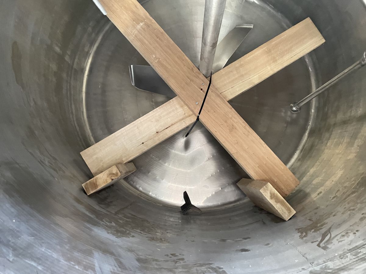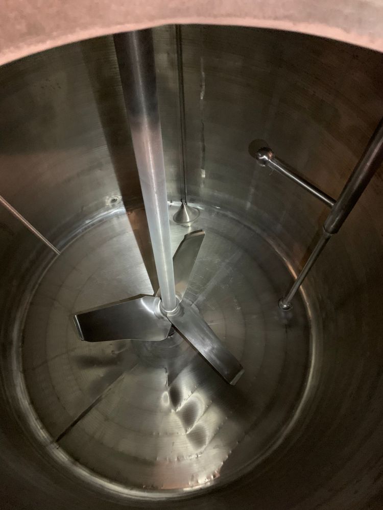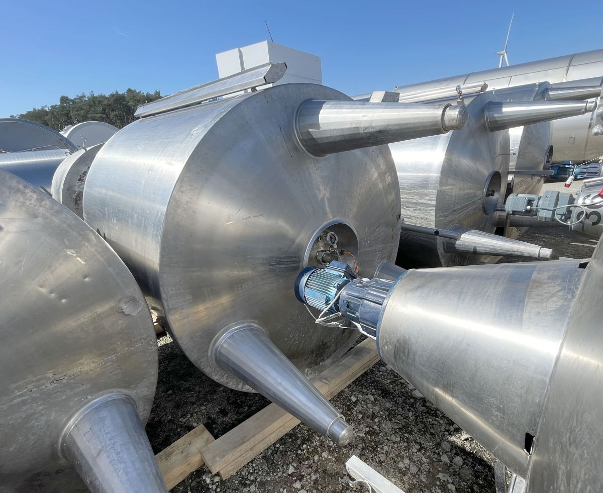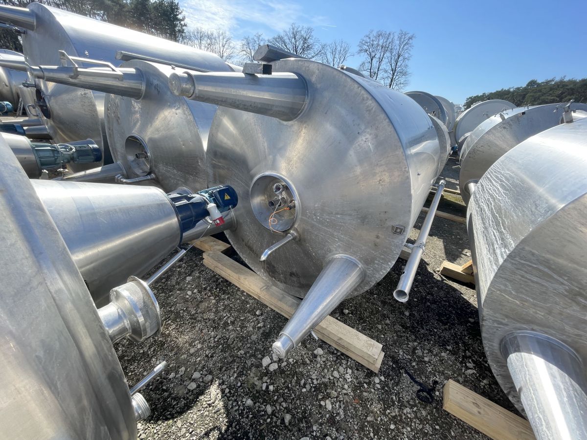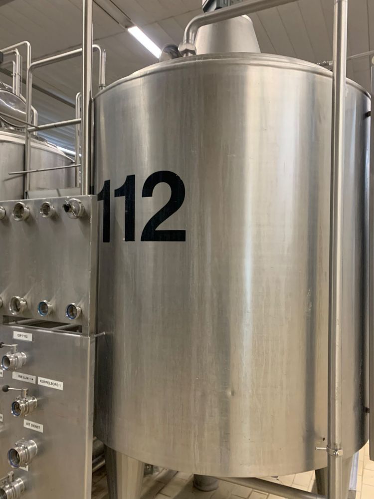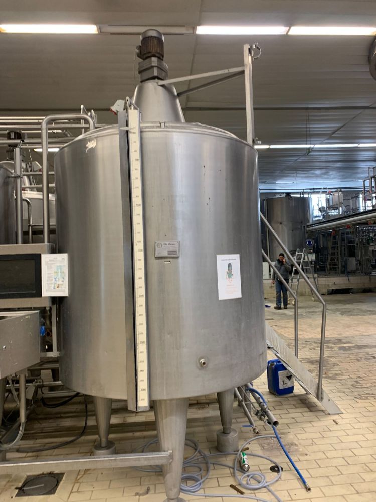 Article type: second-hand mixing tank Additional information: we can’t give any guarantees about the heating/cooling jacket; we can’t give any guarantees about the agitator Volumetric volume (L): 3.000 L Pressure in tank: ATM - atmosferic Material wet parts: SS AISI 304 (V2A) Model: vertical Configuration: insulated with heat-exchanger Heat exchanger: yes Insulation: yes Mobile tank: no Top type: conical Shape of tank: cylindrical Bottom type: conical Bottom outlet: yes Total discharge: yes Fixation points: 3 adjustable feet Type of HE on the cylinder: half pipe welded onto the outside of the innertank Position HE: the complet cilinder Type of HE on the bottom: half pipe welded onto the outside of the innertank Manway(s): RVS 304 Gasket manway(s): unknown Fixation point(s): RVS 304 Suitable for food industry: yes Documents included: no Technical drawing included: no Registration plate on the tank: no Flange for agitator: no Number of manways: 1 Position of manway: at the top Height manhole 1 (mm): 350 mm x H 440 mm Hinged lid: yes Tank outlet: inside Ø 50 mm Agitator: yes Agitator type: propeller agitator Position engine: at the top Power: 1,10 Voltage: 400 V - three-phase Current: 2,95 Distance from outlet to ground: 700 mm Outer diameter tank: 1.700 mm Cylinder height: 1.650 mm Total height of tank: 3.000 mm Empty weight tank: 910