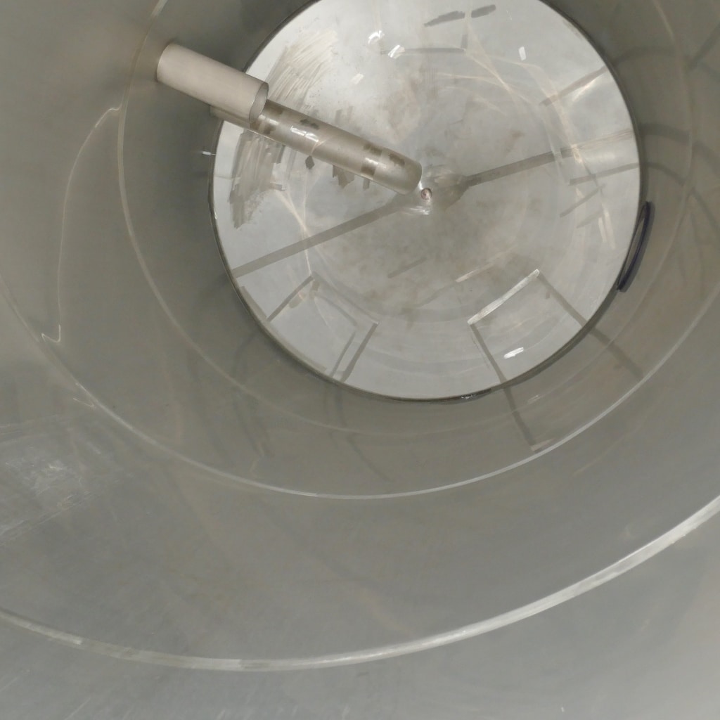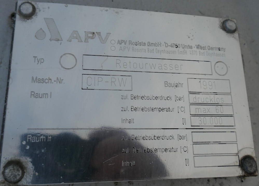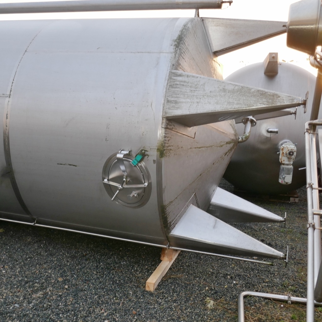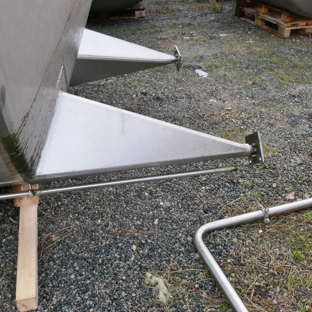 Additional information: Chemistry; 2 pipes inside the tank; 1 pipe outside the tank; Wall thickness of the lowest cylinder segment 3.0 mm Volumetric volume (L): 30.000 L Pressure in tank: ATM - atmosferic Material wet parts: SS AISI 304 (V2A) Model: vertical Configuration: single-skin Heat exchanger: no Insulation: no Mobile tank: no Total discharge: yes Documents included: no Technical drawing included: no Registration plate on the tank: yes Flange for agitator: no Position of manway: cylinder Outlet of tank: 55 Top: 2,60 mm Cylinder: 2,60 mm Bottom: 4 mm Internal diameter tank: 2.500 mm Cylinder height: 5.990 mm Total height of tank: 7.700 mm