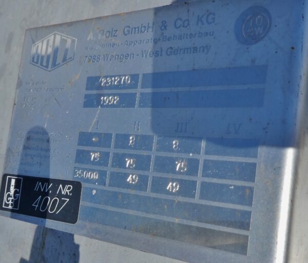 Fat storage tank in the food industry; Base made of lightweight concrete around the lower bottom (see photos); Manhole in the upper bottom DN 415; Manhole in the cylinder DN 600 (cover of the
