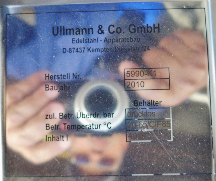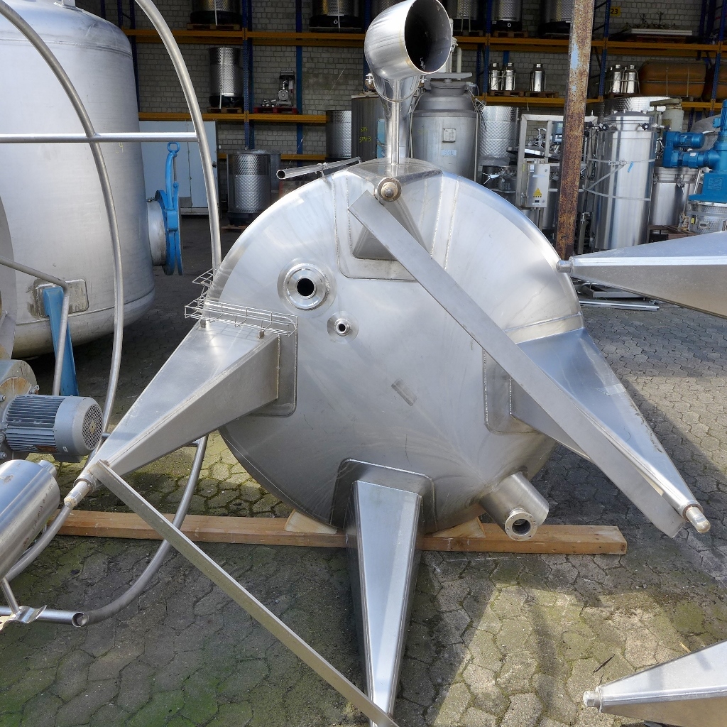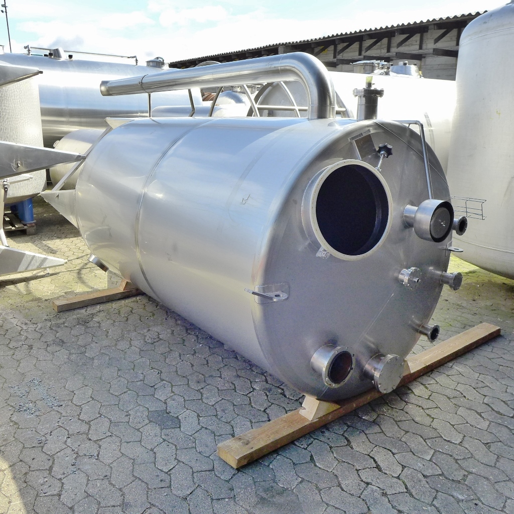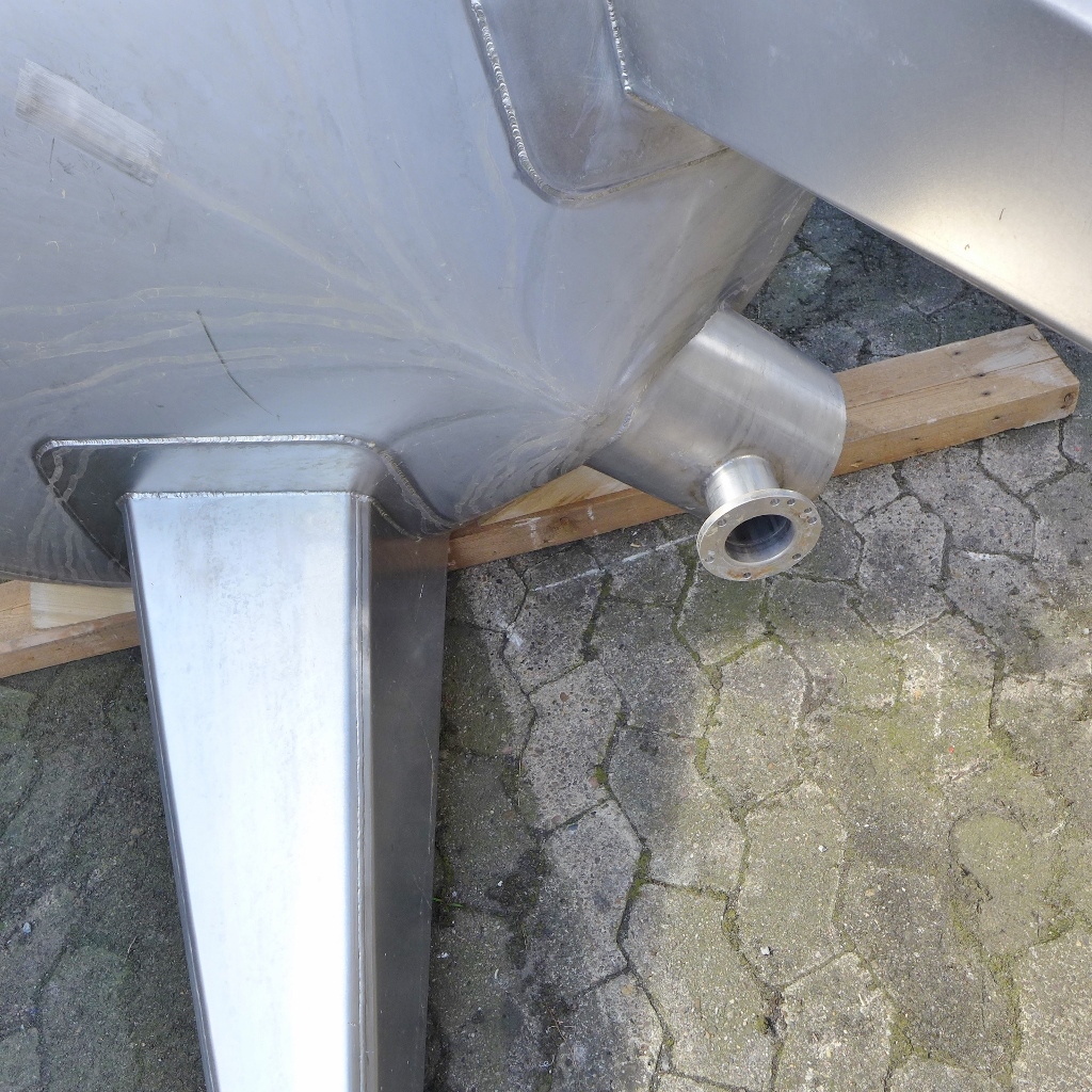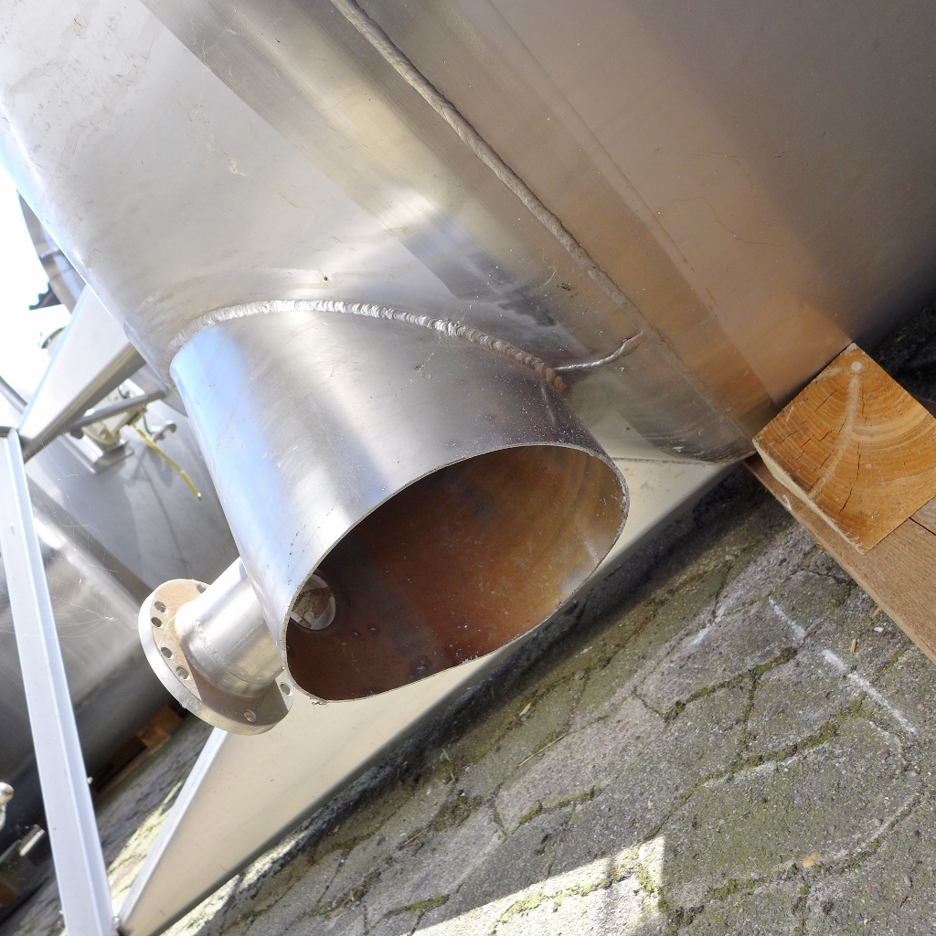 Additional information: Food industry; 1 external pipe; brownish adhesions inside the tank (probably lime); Outlet on cut pipe (diameter 200 mm; see photos); manhole cover is missing Volumetric volume (L): 4.000 L Pressure in tank: ATM - atmosferic Material wet parts: SS AISI 304 (V2A) Model: vertical Configuration: single-skin Heat exchanger: no Insulation: no Mobile tank: no Total discharge: no Documents included: no Technical drawing included: no Registration plate on the tank: yes Flange for agitator: no Position of manway: in the bottom Outlet of tank: flange DN50 Internal diameter tank: 1.500 mm Cylinder height: 2.490 mm Total height of tank: 4.050 mm