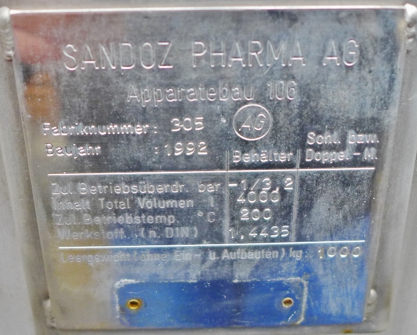 Pharmaceutical Chemistry; Bearing saddles, Fe; Manhole DN 500 (manhole cover plated); Tank inside with dip tubes and adhesions