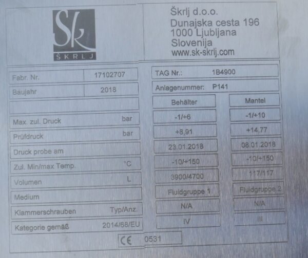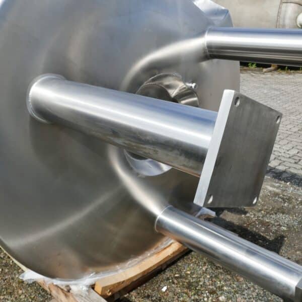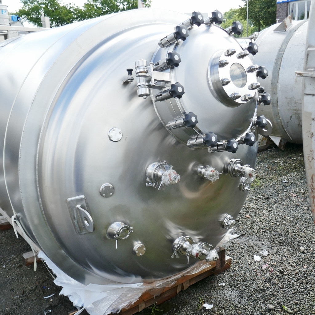Tank was manufactured for a global pharmaceutical company but was never put into operation; Diameter of outlet (fitting) approx. 44 mm; we can’t give any guarantees about the heating/cooling jacket