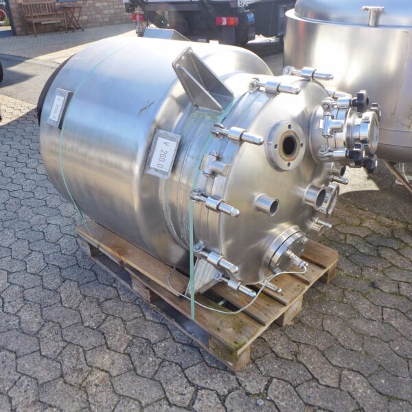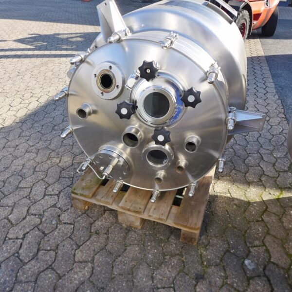 Acids and alkalis; 3 support brackets, Aisi 304; 1 hand hole DN 200 in the upper bottom; Metallic discolouration inside; we can’t give any guarantees about the heating/cooling jacket