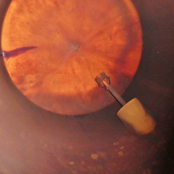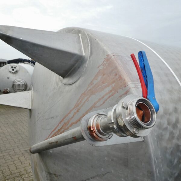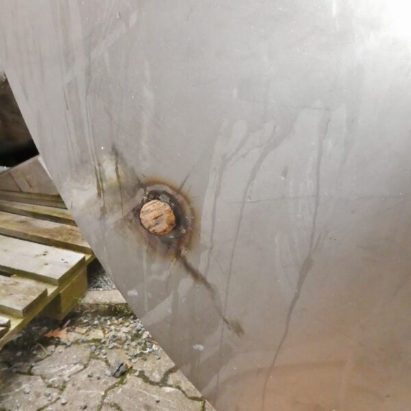 Spirits; Diameter manhole 480 mm; stronger adhesions inside the tank; 1 connection in the upper bottom was cut out by the previous operator (see photos) ; Metallic discolouration inside; we can’t