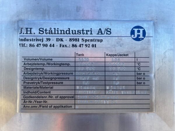 Ångtryck värmeväxlare: 4 Bar Arbetstemperatur värmeväxlare cylinder: 152 °C Hydrauliskt provtryck botten: 5,90 Bar Hydrauliskt provtryck: 5,90 Bar Position värmeväxlare: the complet cilinder Typ av värmeväxlare på cylinder: dimple-jacket Vattentryck värmeväxlare: 4,50 Bar