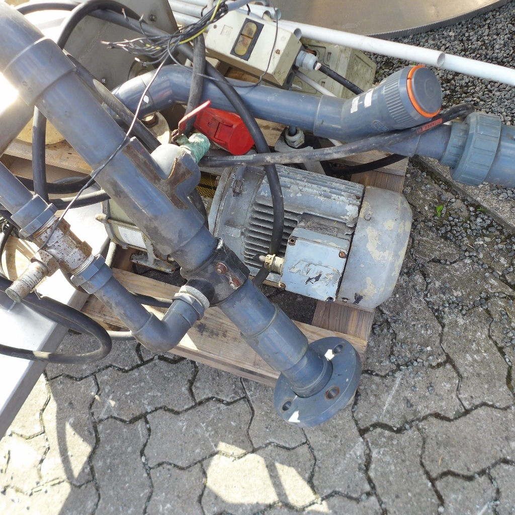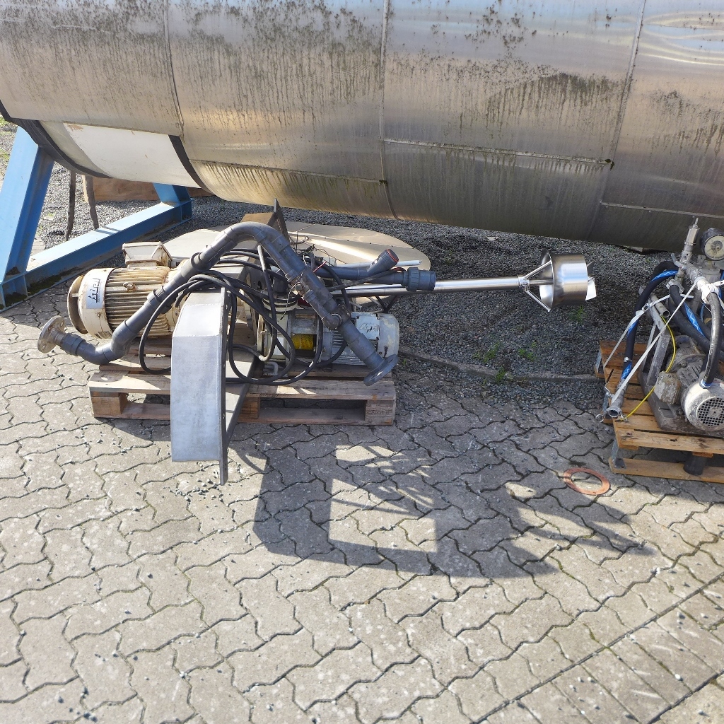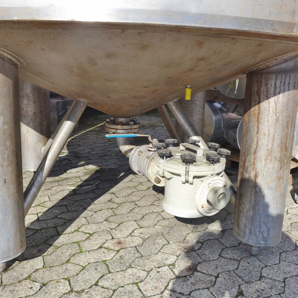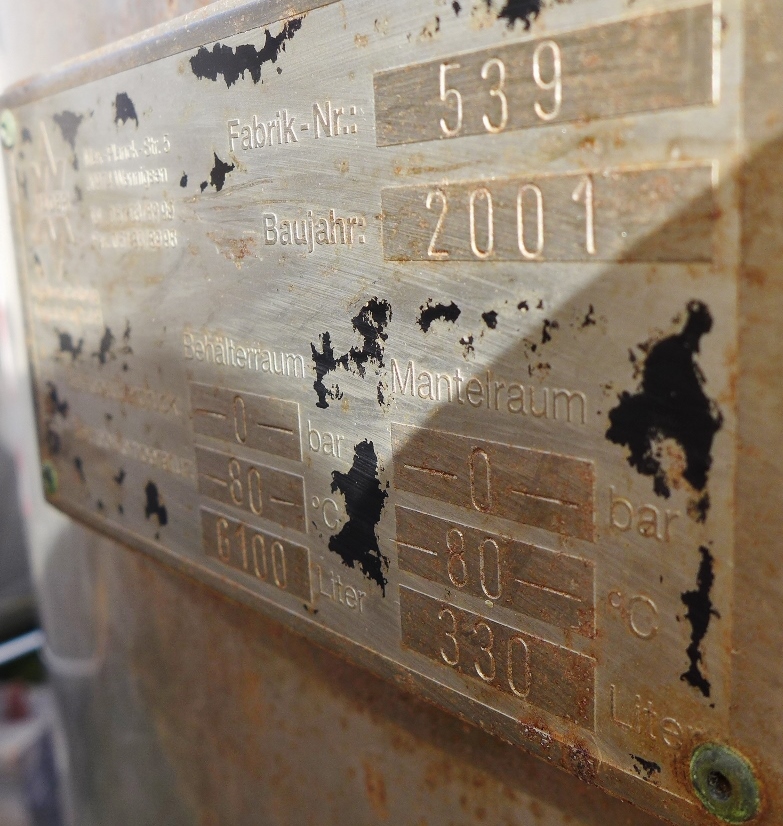Additional information: Chemistry; Insulation only around the cylindrical part of the tank; flanged to the outlet is a reducing fitting (reduced to an inside pipe diameter of 50 mm; fitting components made of plastic); 1 pump is included (see photos) Volumetric volume (L): 6.100 L Pressure in tank: ATM - atmosferic Max. temperature (°C): 80 °C Material wet parts: SS AISI 316 (V4A) Model: vertical Configuration: insulated with heat-exchanger Heat exchanger: yes Insulation: yes Mobile tank: no Total discharge: yes Volume: 330 L Max. working temperature: 80 °C Type HE on the cylinder: heating/cooling jacket Documents included: no Technical drawing included: no Registration plate on the tank: yes Flange for agitator: no Outlet of tank: flange DN80 Agitator: yes Number of revolutions: 725 / 1450 Power: 3.6 / 5.3 Cylinder: 6,20 mm Bottom: 4 mm Internal diameter tank: 1.990 mm Outer diameter tank: 2.170 mm Cylinder height: 1.800 mm Total height of tank: 3.650 mm